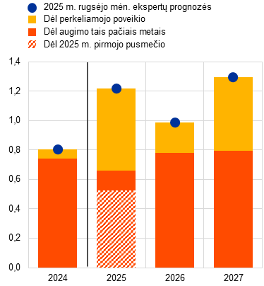 Pastabos: vertikalia linija pažymėta prognozių laikotarpio pradžia. Korekcijos apskaičiuotos remiantis nesuapvalintais skaičiais. Stulpelis raudonais dryželiais – tai 2025 m. pirmojo ir antrojo ketvirčių rezultatų poveikis 2025 m. augimui.