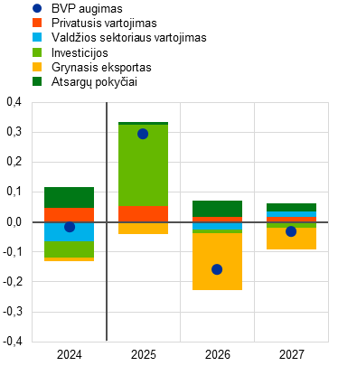 Realiojo BVP augimą ir toliau turėtų skatinti privatusis vartojimas. Kalbant apie išlaidas (žr. 2 pav. a grafiką), numatoma, kad prognozių laikotarpiu privatusis vartojimas sparčiai augs ir bus daugiausiai prie realiojo BVP augimo prisidėsiantis veiksnys. Be to, nuo 2025 iki 2027 m. valdžios sektoriaus vartojimas ir bendros investicijos turėtų kasmet didėti, o numatomą stiprų poveikį, kilsiantį dėl staigaus viešųjų investicijų sumažėjimo 2027 m. pasibaigus finansavimui NGEU dotacijomis, turėtų kompensuoti privačiosios investicijos. Tačiau grynojo eksporto indėlis į realiojo BVP augimą 2025 ir 2026 m. – priešingai – bus neigiamas. Importo indėlis (atitinkamai –1,2 ir –0,9 procentinio punkto) nusveria eksporto indėlį (atitinkamai 0,6 ir 0,5 procentinio punkto), tačiau tai iš dalies atsveria teigiamas atsargų pokyčio indėlis 2025 m. (žr. 2 pav. b grafiką). Labai didelis atsargų svyravimas 2025 m. susijęs su atsargų kaupimu ir mažinimu, kurį skatino prekybos paankstinimas ir vėlesnis šio paankstinimo poveikio sumažėjimas.