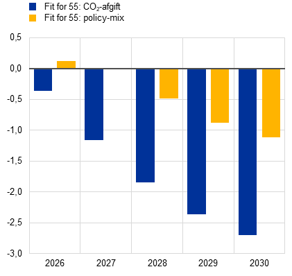 Basisfremskrivningen omfatter ingen virkning vedrørende yderligere EU-foranstaltninger, der indgår i Fit for 55-pakken, da deres virkning enten ikke blev anslået eller blev anset for at være ubetydelig. Dette er i overensstemmelse med Europa-Kommissionens efterårsprognose fra 2025, som anslår, at CO2-grænsetilpasningsmekanismen vil have en ubetydelig indvirkning på inflationen på kort sigt.
