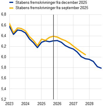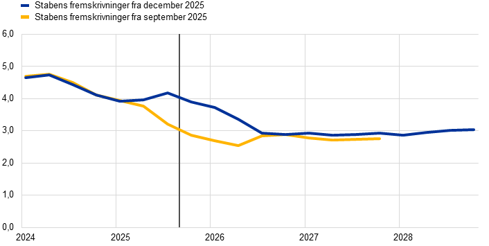 Inflationen forventes at falde fra 2,1 pct. i 2025 til 1,9 pct. i 2026 og derefter til 1,8 pct. i 2027, inden den stiger til ECB's mål på 2 pct. på mellemlangt sigt i 2028. Det forventede fald i den samlede inflation (målt ved det harmoniserede forbrugerprisindeks – HICP) i begyndelsen af 2026 afspejler en nedadrettet basiseffekt af energipriserne, mens inflationen i komponenter ekskl. energi forventes fortsat at aftage i hele 2026. Energiinflationens bidrag til den samlede inflation ventes at forblive afdæmpet indtil slutningen af 2027 for derefter at stige markant i 2028 som følge af den forventede gennemførelse af EU's emissionshandelssystem 2 (ETS2) med en opadrettet effekt på den samlede inflation på 0,2 procentpoint. HICP-inflationen ekskl. energi forventes at falde fra 2,5 pct. i 2025 til 2,2 pct. i 2026 og til 2,0 pct. i 2027 og 2028. Fødevareinflationen ventes at falde mærkbart i takt med, at virkningerne af tidligere prisstigninger på globale råvarer til fødevarer og ugunstige vejrforhold i løbet af sommeren aftager, og ventes at stabilisere sig på et niveau noget over 2 pct. fra slutningen af 2026. HICP-inflationen ekskl. energi og fødevarer (HICPX) ventes at aftage fra 2,4 pct. i 2025 til 2,0 pct. i 2028, efterhånden som inflationen i tjenesteydelser falder som følge af aftagende pres på arbejdskraftsomkostningerne, og i takt med at den tidligere appreciering af euroen slår igennem i priskæden, hvorved vareinflationen dæmpes. Lønvæksten forventes fortsat at aftage i 2026, inden den stabiliserer sig på omkring 3 pct., understøttet af et robust arbejdsmarked og produktivitetsvækst lige under 1 pct. Væksten i enhedslønomkostningerne forventes at aftage, selvom effekten på inflationen ventes at blive delvis opvejet af en gradvis stigning i avancerne i fremskrivningsperioden. Sammenlignet med fremskrivningerne fra september 2025 er udsigterne for den samlede HICP-inflation blevet opjusteret med 0,2 procentpoint for 2026, hvilket afspejler de seneste dataoverraskelser for HICP-inflationen og lønvæksten, hvor sidstnævnte har ført til en betydelig opjustering af lønudsigterne. Fremskrivningen af HICP-inflationen er nedjusteret en anelse for 2027 som følge af antagelsen om et lavere bidrag fra energiinflationen, idet gennemførelsen af ETS2 nu forventes at blive udskudt fra 2027 til 2028, selvom dette bidrag til dels synes at blive opvejet af en stærkere inflation i tjenesteydelser.