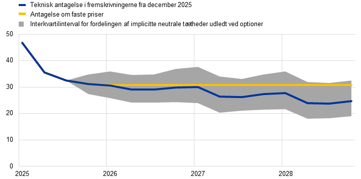 Hvad angår de tekniske antagelser, er ændringerne samlet set begrænsede i forhold til fremskrivningerne fra september, bortset fra antagelserne om energipriserne og ETS-priserne. Antagelserne om oliepriserne er blevet nedjusteret med ca. 4 pct. i gennemsnit for 2026-27 og engrospriserne på gas med 8,6 pct., mens den futuresbaserede antagelse om prisen på ETS1-kvoter er steget markant med ca. 15 pct. Efter de seneste meddelelser antages indførelsen af ETS2-ordningen nu at blive udskudt med et år til 2028, og prisantagelsen er baseret på den pris, som Europa-Kommissionen anvendte i sin efterårsprognose fra 2025 (46 EUR pr. ton CO2, hvilket er betydeligt under den værdi på 59 EUR pr. ton CO2, der blev antaget for 2027 i de tidligere fremskrivninger fra Eurosystemet/ECB, se boks 2 for yderligere oplysninger)[6]. Euroen er deprecieret med 0,5 pct. over for den amerikanske dollar og den nominelle effektive eurokurs med 0,1 pct. siden fremskrivningerne fra september. Antagelserne om den korte rente er kun blevet justeret marginalt, mens antagelserne om de lange renter er blevet nedjusteret med 0,2 procentpoint for både 2026 og 2027.