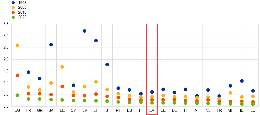De uitvoerprijzen van concurrenten van het eurogebied zullen volgens de projecties minder snel stijgen dan het historisch gemiddelde en zijn naar beneden toe bijgesteld ten opzichte van de projecties van september. De uitvoerprijzen van concurrenten van het eurogebied (op jaarbasis en gemeten in nationale valuta) nemen volgens de projecties toe met 1,1% in 2025, met 1,6% in 2026 en met 2,0% in zowel 2027 als 2028. Dit is minder dan het historisch gemiddelde van 2,6% in de periode 2000-2019, aangezien de Chinese uitvoerprijsinflatie op jaarbasis naar verwachting tot het derde kwartaal van 2026 negatief zal blijven. Vergeleken met de vorige projecties zijn de uitvoerprijzen van concurrenten voor de gehele projectieperiode neerwaarts bijgesteld als gevolg van een lager beloop van de exportprijsinflatie in geavanceerde economieën, waaronder de Verenigde Staten en verschillende EU-lidstaten buiten het eurogebied, en in mindere mate in China.