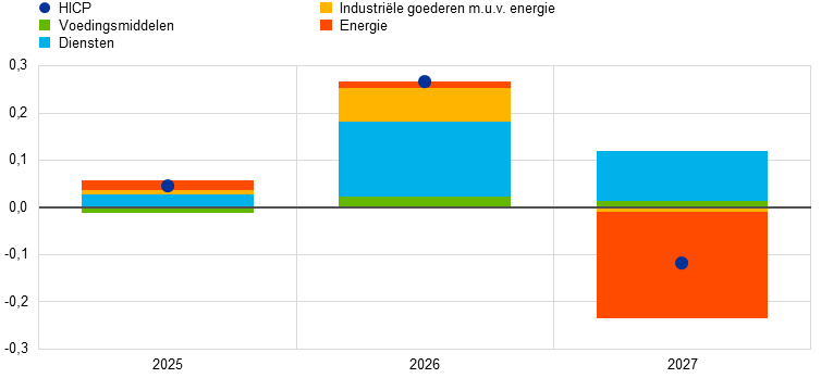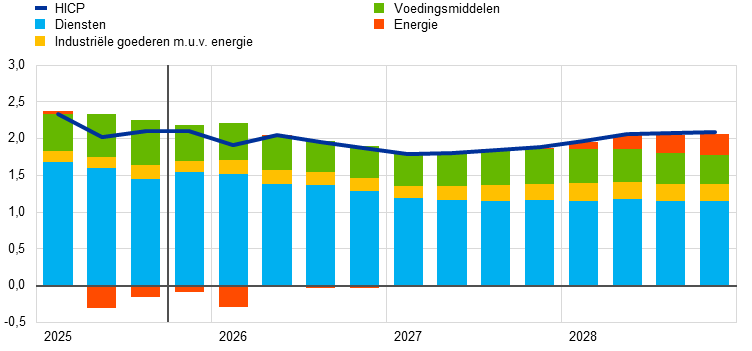 De inflatie zal naar verwachting dalen van 2,1% in 2025 naar 1,9% in 2026 en vervolgens naar 1,8% in 2027, alvorens in 2028 te stijgen naar de doelstelling van de ECB van 2% op middellange termijn. De verwachte daling van de totale inflatie (gemeten aan de hand van de geharmoniseerde consumptieprijsindex (HICP)) begin 2026 weerspiegelt een neerwaarts basiseffect van de energieprijzen, terwijl de inflatie in de niet-energiecomponenten gedurende 2026 zou moeten blijven afnemen. De bijdrage van de energie-inflatie aan de totale inflatie blijft tot eind 2027 gematigd, alvorens in 2028 aanzienlijk te stijgen als gevolg van de verwachte invoering van het EU-emissiehandelssysteem 2 (ETS2), met een opwaarts effect van 0,2 procentpunt op de totale inflatie. Volgens de projecties daalt de HICP-inflatie exclusief energie van 2,5% in 2025 naar 2,2% in 2026 en 2,0% in 2027 en 2028. De verwachting is dat de voedselinflatie aanmerkelijk zal dalen naarmate de effecten van de eerdere wereldwijde prijsstijgingen van voedingsgrondstoffen en de ongunstige weersomstandigheden gedurende de zomer afnemen. Vanaf eind 2026 stabiliseert de voedselinflatie zich dan iets boven de 2%. De HICP-inflatie exclusief energie en voedingsmiddelen (HICPX) matigt van 2,4% in 2025 tot 2,0% in 2028, doordat de diensteninflatie daalt tegen de achtergrond van afnemende arbeidskostendruk en naarmate de eerdere appreciatie van de euro doorwerkt in de prijsketen, waardoor de goedereninflatie wordt afgeremd. Verwacht wordt dat de loongroei geheel 2026 gematigd zal blijven, alvorens zich rond 3% te stabiliseren, ondersteund door een veerkrachtige arbeidsmarkt en een productiviteitsgroei net onder de 1%. De groei van de arbeidskosten per eenheid product zal naar verwachting afnemen, hoewel het effect daarvan op de inflatie deels tenietgedaan wordt door een geleidelijk herstel van de winstmarges gedurende de projectieperiode. Vergeleken met de projecties van september 2025 zijn de vooruitzichten voor de totale HICP-inflatie voor 2026 met 0,2 procentpunt naar boven toe bijgesteld vanwege de recente onverwacht hogere cijfers voor de HICP-inflatie en de loongroei. Deze laatste factor heeft geleid tot een aanzienlijke opwaartse herziening van de loonvooruitzichten. De projectie voor de HICP-inflatie voor 2027 is licht neerwaarts bijgesteld als gevolg van een veronderstelde lagere bijdrage van de energie-inflatie, aangezien de invoering van ETS2 nu naar verwachting wordt uitgesteld van 2027 tot 2028, hoewel deze bijdrage deels wordt gecompenseerd door een sterkere diensteninflatie.