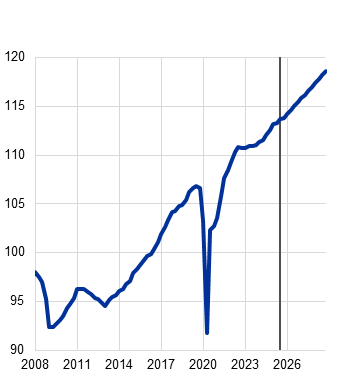 Rast stroškov dela na enoto proizvoda se bo po projekcijah tekom leta 2027 zmanjšala, k čemur bo prispevala nižja rast plač in do neke mere tudi višja produktivnost, nato pa se bo leta 2028 ustalila na 2,1-odstotni ravni. Rast stroškov dela na enoto proizvoda se je v tretjem četrtletju 2025 rahlo povečala in bo do začetka leta 2026 predvidoma ostala nad 3%. Zaradi umirjanja rasti sredstev za zaposlene na zaposlenega naj bi se rast stroškov dela na enoto proizvoda v celotnem letu 2026 upočasnjevala. V povprečju naj bi se rast stroškov dela na enoto proizvoda umirila s 3,3% v letu 2025 na 2,6% v letu 2026 in 2,0% v letu 2027, nato pa naj bi se leta 2028 rahlo povečala na 2,1%, kar je nekoliko nad dolgoročnim povprečjem. V primerjavi s septembrskimi projekcijami je bila rast stroškov dela na enoto proizvoda popravljena navzgor za vsako leto v obdobju projekcij, in sicer zaradi močnejše rasti plač kljub rahlo višji produktivnosti.