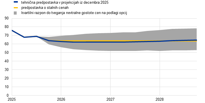 Opombe: Popravki so izraženi kot odstotek pri ravneh ter kot odstotne točke pri stopnjah rasti in odstotkih na leto. Popravki pri stopnjah rasti in obrestnih merah se izračunajo s števili, zaokroženimi na eno decimalko, medtem ko se popravki, ki so prikazani kot spremembe v odstotkih, izračunajo z nezaokroženimi števili. Tehnične predpostavke o obrestnih merah v euroobmočju in cenah surovin temeljijo na tržnih pričakovanjih, s presečnim datumom na dan 26. novembra 2025. Cene nafte se nanašajo na promptne in terminske cene surove nafte Brent. Cene plina se nanašajo na promptne in terminske cene plina na nizozemskem vozlišču za trgovanje s plinom TTF. Cene električne energije se nanašajo na povprečje veleprodajnih promptnih in terminskih cen iz petih največjih držav euroobmočja. »Sintetična« terminska cena pravic iz sistema ETS1 je izpeljana kot linearno interpolirana vrednost ob koncu meseca za dve najbližji terminski ceni pravic do emisij na borzi European Energy Exchange. Nato se iz mesečnih terminskih cen pravic do emisij izračuna povprečje, iz katerega se izpelje medletna vrednost. Ker večjega trgovanja s pravicami iz sistema ETS2 še ni, so strokovnjaki predpostavke o cenah določili v skladu s predpostavko Evropske komisije iz gospodarske napovedi iz jeseni 2025 (več podrobnosti je v okvirju 2). Gibanja cen primarnih surovin izhajajo iz terminskih trgov v desetih delovnih dneh do presečnega datuma. Predpostavka za dvostranske devizne tečaje je, da bodo v obdobju projekcij ostali nespremenjeni na povprečni ravni, ki je bila zabeležena v desetih delovnih dneh do presečnega datuma. Predpostavke o nominalni donosnosti 10-letnih državnih obveznic v euroobmočju temeljijo na povprečju donosnosti 10-letnih obveznic posameznih držav, tehtanem z letnim BDP. Kjer obstajajo podatki, je nominalna donosnost 10-letnih državnih obveznic posameznih držav opredeljena kot donosnost 10-letnih referenčnih obveznic, podaljšana s terminsko kuponsko donosnostjo, ki je na presečni datum izpeljana iz krivulje donosnosti za posamezno državo. Za druge države je donosnost 10-letnih državnih obveznic opredeljena kot donosnost 10-letnih referenčnih obveznic, podaljšana s statičnim pribitkom (zabeleženim na presečni datum) na tehnično predpostavko o netveganih dolgoročnih obrestnih merah v euroobmočju.
