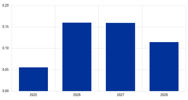 Vpliv na inflacijo, vključen v osnovno projekcijo, je po ocenah manjši od 0,1 odstotne točke kumulativno v obdobju 2025–2028.