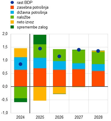 K realni rasti BDP naj bi še naprej prispevalo domače povpraševanje, negativen prispevek neto izvoza pa naj bi se v obdobju 2027–2028 zmanjšal na nič. Z vidika izdatkov (graf 3, slika a) bo rast zasebne potrošnje predvidoma močna v celotnem obdobju projekcij in bo zato največ prispevala k realni rasti BDP. H krepitvi potrošnje gospodinjstev bo predvidoma prispevalo povečevanje njihove kupne moči, kar odraža močno rast plač in zaposlenosti zaradi nadaljnje odpornosti trga dela. Poleg tega naj bi bila rast naložb hitrejša od rasti BDP v celotnem obdobju projekcij. Zasebne naložbe bodo po pričakovanjih odtehtale upočasnitev javnih naložb v obdobju 2027–2028 zaradi izteka financiranja iz programa »EU naslednje generacije« (NGEU). V obdobju projekcij naj bi k rasti naložb prispevali zmanjšanje negotovosti, zvišanje izdatkov za obrambo in infrastrukturo ter krepitev dobička in izboljšanje pogojev povpraševanja, povezana s cikličnim okrevanjem. Nasprotno bo rast izvoza predvidoma ostala umirjena kljub izboljšanju zunanjega povpraševanja, saj vztrajni izzivi na področju konkurenčnosti v euroobmočju, ameriške carine in pretekla apreciacija eura negativno vplivajo na izvozno uspešnost. Zaradi tega se bo najverjetneje še nadalje zmanjšal delež na izvoznih trgih. Zato bo prispevek neto izvoza k realni rasti BDP v letih 2025 in 2026 po projekcijah negativen, pri čemer bo rast uvoza hitrejša od rasti izvoza. Negativni prispevek naj bi se deloma odtehtal s pozitivnim prispevkom spremembe zalog v letu 2025.