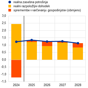 Zasebna potrošnja naj bi se vztrajno povečevala, k čemur bo prispevalo zvišanje prejemkov iz delovnega razmerja in dohodka iz premoženja in kapitala. Zasebna potrošnja se je v zadnjih četrtletjih še naprej povečevala – čeprav počasneje kot v drugi polovici leta 2024, kar odraža povečano gospodarsko negotovost. Rast potrošnje se bo v prihodnjih četrtletjih po pričakovanjih ponovno nekoliko okrepila in bo v obdobju 2026–2028 predvidoma znašala okrog 1,2% na medletni ravni, kar je večinoma v skladu z dolgoročnim povprečjem (graf 4, slika a). Ti obeti so večinoma posledica povečevanja realnega razpoložljivega dohodka, ki ga podpira predvsem dohodek od dela in v manjši meri dohodek iz premoženja in kapitala. Predpostavlja se, da bo zaupanje potrošnikov v srednjeročnem obdobju postopno okrevalo proti običajni zgodovinski ravni. K temu prispevajo obeti o na splošno odpornem trgu dela, zaradi česar naj bi se postopno malo znižala tudi stopnja varčevanja gospodinjstev (graf 4, slika b). Vseeno bo stopnja varčevanja najverjetneje ostala povišana zaradi povečane gospodarske negotovosti in morebitnega ricardianskega učinka v državah, ki so napovedale javnofinančne spodbude. Ta učinek podpirajo tudi podatki iz ankete ECB o pričakovanjih potrošnikov. Obrestne mere ostajajo nekoliko nad dolgoročnim povprečjem in dostop do kreditov je še naprej otežen, kar najverjetneje prav tako prispeva k povišani stopnji varčevanja. Vseeno pa ni jasno, ali so ta dolgoročna povprečja prava referenčna vrednost za srednjeročno obdobje, saj je gospodarstvo v obdobju po pandemiji pretreslo več velikih šokov. Poleg tega bi gospodinjstva lahko potrebovala prihranke za financiranje višjih stanovanjskih naložb v prihodnosti. Kljub ugodnejši dinamiki realnega razpoložljivega dohodka v obdobju projekcij je realna zasebna potrošnja večinoma nespremenjena, saj bo močnejše zvišanje dohodka predvidoma privedlo do vztrajno višje stopnje varčevanja.