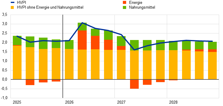 Die am Harmonisierten Verbraucherpreisindex (HVPI) gemessene Inflation wird den Projektionen zufolge im zweiten Quartal 2026 drastisch auf 3,1 % ansteigen, bedingt durch einen sprunghaften Anstieg der Teuerung bei Energie infolge der Krise im Nahen Osten. Im dritten Quartal wird sie auf 2,8 % zurückgehen, nachdem die Preise für Energierohstoffe, wie aus den Preisen für Terminkontrakte ersichtlich, gesunken sind. Dem Basisszenario zufolge wird die Teuerungsrate für Energie 2027 vor allem aufgrund abwärtsgerichteter Basiseffekte im Energiebereich ins Negative gehen und danach 2028 deutlich ansteigen, wenn die Umsetzung des EU-Emissionshandelssystems 2 (EU-EHS 2) die Gesamtinflation um 0,2 Prozentpunkte erhöhen dürfte. Die Teuerung bei Nahrungsmitteln wird den Projektionen zufolge ab Ende 2026 anziehen, da der Kostendruck, der sich aus dem sprunghaften Anstieg der Energiepreise ergibt, auf die Verbraucherpreise für Nahrungsmittel durchwirkt, bevor er 2028 nachlässt. Die HVPI-Inflation ohne Energie und Nahrungsmittel (HVPIX) dürfte sich von 2,4 % im Jahr 2025 auf 2,1 % im Jahr 2028 abschwächen. Zwar wird die HVPIX-Inflation auch durch den von den höheren Energiepreisen ausgehenden Kostendruck beeinflusst, doch dürfte dies durch einen etwas nachlassenden Arbeitskostendruck, die zurückliegende Aufwertung des Euro und die Importdurchdringung aus China gedämpft werden. Insgesamt wird den Basisprojektionen zufolge die HVPI-Inflation von 2,1 % im Jahr 2025 auf 2,6 % im Jahr 2026 steigen, bevor sie 2027 auf 2,0 % zurückgeht und 2028 leicht auf 2,1 % ansteigt. Das Lohnwachstum wird sich in den kommenden Jahren abschwächen, wenn auch langsamer als in früheren Projektionen erwartet. Grund hierfür sind einige Inflationsausgleichseffekte im Zusammenhang mit dem Energiepreisschock. Im Vergleich zu den Projektionen vom Dezember 2025 wurden die Aussichten für die HVPI-Gesamtinflation für 2026 vor allem aufgrund der Energiekomponente um 0,7 Prozentpunkte nach oben revidiert. Für 2027 wurden sie um 0,2 Prozentpunkte und für 2028 um 0,1 Prozentpunkte nach oben revidiert, da der von den höheren Energiepreisen ausgehende Kostendruck auf die HVPIX- und Nahrungsmittelkomponenten durchwirkt, während die Energiekomponente etwas nach unten revidiert wurde.