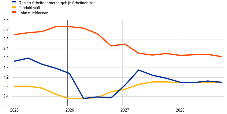 Der Arbeitsmarkt dürfte insgesamt robust bleiben, da davon ausgegangen wird, dass die Unternehmen als Reaktion auf einen vorübergehenden Rückgang der Wirtschaftstätigkeit infolge des Krieges im Nahen Osten Arbeitskräfte horten. Im Jahr 2025 ging das Beschäftigungswachstum nach Jahren eines recht kräftigen Wachstums zurück. Bereits vor dem Krieg im Nahen Osten wurde für 2026 und 2027 mit einem Rückgang des Beschäftigungswachstums als Fortsetzung der Phase des Abbaus von Ungleichgewichten gerechnet. Angesichts des negativen Produktionsschocks, der sich aus den angenommenen vorübergehenden negativen Folgen des Krieges im Nahen Osten ergibt, wird davon ausgegangen, dass die Unternehmen im aktuellen Klima auf kurze Frist allgemein Arbeitskräfte horten werden. Dieser Effekt könnte jedoch durch den Druck gedämpft werden, den die hohen Vorleistungskosten auf die Gewinne ausüben, wodurch der Spielraum für das Horten von Arbeitskräften eingeschränkt werden würde. Insgesamt dürfte das Beschäftigungswachstum 2027 und 2028 stärker zurückgehen als in den Projektionen vom Dezember angenommen (siehe Abbildung 4, Grafik a). Dieser Anpassungspfad führt zu kurzfristigen Abwärtsrevisionen des Wachstums der Arbeitsproduktivität gegenüber den Projektionen vom Dezember, die durch Zuwächse in den Jahren 2027 und 2028 ausgeglichen werden. Die Arbeitslosenquote dürfte 2026 ebenfalls leicht steigen, gefolgt von einem Rückgang ab 2027, und bis Ende 2028 ein Niveau von 6,1 % erreichen – eine Aufwärtsrevision gegenüber den Projektionen vom Dezember (siehe Abbildung 4, Grafik b).