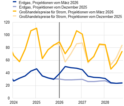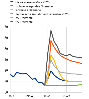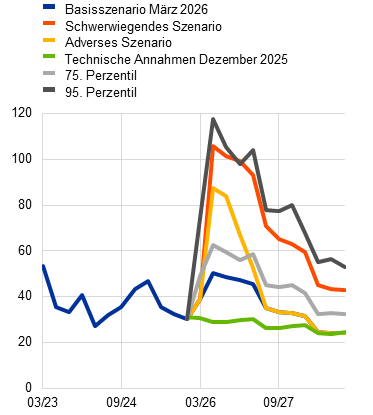 Schließlich spiegeln eine Reihe von Projektionen auf der Grundlage technischer Annahmen mit Stichtag 4. März (unter Einbezug von Informationen aus den ersten drei Arbeitstagen nach Kriegsbeginn im Nahen Osten) einen günstigeren Ausblick wider: Die Öl- und Gaspreise dürften im zweiten Quartal 2026 mit 79 USD je Barrel bzw. 48 € je MWh ihren Höchststand erreichen.[2] Im Einklang mit diesen Projektionen würde die Inflation im Jahr 2026 0,3 Prozentpunkte unter dem endgültigen Basisszenario und in den Jahren 2027 und 2028 jeweils 0,1 Prozentpunkte unter dem endgültigen Basisszenario liegen, während das Wachstum in jedem Jahr des Projektionszeitraums 0,1 Prozentpunkte höher ausfallen würde.
