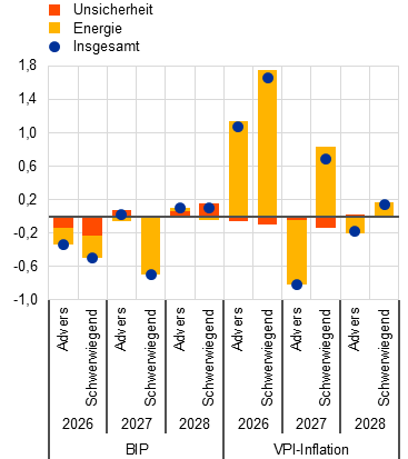 Im schwerwiegenden Szenario wird angenommen, dass die Energiepreise stärkere und länger anhaltende Auswirkungen haben und von den Auswirkungen der erhöhten Unsicherheit begleitet werden. Das Wachstum des realen BIP fällt in den Jahren 2026 und 2027 um 0,5 bzw. 0,4 Prozentpunkte niedriger aus, wobei die vierteljährlichen Wachstumsraten im zweiten und dritten Quartal 2026 im negativen Bereich liegen (siehe Abbildung 14, Grafik a). Während der Energieschock nach wie vor die Hauptursache ist, spielt die Unsicherheit zusammen mit globalen Übertragungseffekten auch eine Rolle und verstärkt den Abschwung. Die HVPI-Inflation ist 2026 um 1,8 Prozentpunkte höher und bleibt erhöht. Im Jahr 2027 liegt sie 2,8 Prozentpunkte und im Jahr 2028 0,7 Prozentpunkte über dem Basisszenario. Die Auswirkungen auf die HVPIX-Inflation sind stärker als im adversen Szenario, um mehr als 1 Prozentpunkt in den Jahren 2027 bis 2028.