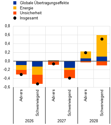 Im adversen Szenario wird angenommen, dass die Auswirkungen auf die Wirtschaft des Euroraums vorübergehend sind und die Auswirkungen auf die Inflation zum Teil nachlassen, was den vorübergehenden Charakter des Schocks widerspiegelt (siehe Abbildung 14). Diese Effekte wirken hauptsächlich über eine Verringerung des real verfügbaren Einkommens aufgrund höherer Energiekosten, eine schwächere Auslandsnachfrage und restriktivere Finanzierungsbedingungen über den VIX-Kanal, wodurch Investitionsentscheidungen beeinflusst werden. Den Simulationen mit dem ECB-BASE-Modell zufolge ist das Wachstum des realen BIP im Jahr 2026 rund 0,3 Prozentpunkte und im Jahr 2027 rund 0,1 Prozentpunkte niedriger als im Basisszenario. Vor dem Hintergrund einer Normalisierung der Energiepreise und einem Rückgang der Unsicherheit erholt sich das BIP-Wachstum zum Teil wieder und liegt 2028 0,2 Prozentpunkte über dem Basisszenario. Der Energieschock ist die Hauptursache für die Abschwächung und führt insbesondere zu einem geringeren Verbrauch. Auch globale Übertragungseffekte, die die Exporte des Euroraums dämpfen, und die Unsicherheit, die die Investitionen belastet, tragen dazu bei. Die HVPI-Gesamtinflation ist 2026 aufgrund höherer Energiepreise um 0,9 Prozentpunkte höher. Vor dem Hintergrund, dass die Energiepreise ausgehend von einem hohen Niveau recht rasch sinken, ist die HVPI-Gesamtinflation 2027 um 0,1 Prozentpunkte höher, 2028 hingegen 0,5 Prozentpunkte niedriger. Grund dafür ist der disinflationäre Druck, der sich in diesem Szenario aus der raschen Normalisierung der Energiepreise nach dem Jahr 2026 ergibt.