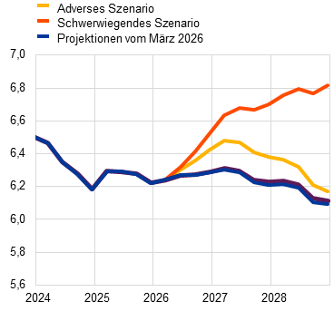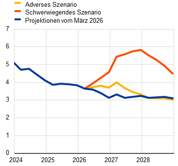 Zusätzlich zu den Basisprojektionen haben die Fachleute alternative, hypothetische Szenarien ausgearbeitet, die sich hinsichtlich der Annahmen über das Ausmaß und die Hartnäckigkeit des Energiepreisschocks, dessen Auswirkungen auf das internationale Umfeld und die Unsicherheit sowie dessen Übertragung über indirekte Auswirkungen und Zweitrundeneffekte auf die Inflation unterscheiden. Diese Szenarien liefern anschauliche Beispiele für divergierende Entwicklungen der Energierohstoffpreise und deren Transmission auf die Wirtschaft des Euroraums. Die Fachleute ordnen diesen Szenarien keine Wahrscheinlichkeiten zu, sie dienen vielmehr dazu, die wesentlichen Unsicherheiten hinsichtlich der Auswirkungen des Konflikts hervorzuheben. Wie in den Projektionen der Fachleute üblich, zeigen diese Szenarien die Auswirkungen auf die Wirtschaft des Euroraums auf, wenn keine geld- oder fiskalpolitische Reaktion erfolgt, die über das im Basisszenario enthaltene Maß hinausgeht. Das adverse Szenario berücksichtigt stärkere indirekte Auswirkungen und Zweitrundeneffekte als das Basisszenario, um mögliche Nichtlinearitäten bei der Übertragung des ersten Energiepreisschocks auf andere Preise in der gesamten Wirtschaft zu erfassen. Dabei wird von einem deutlich stärkeren Anstieg der Energiepreise sowie von einer Zunahme der Unsicherheit und negativer internationaler Ansteckungseffekte (z. B. einer geringeren Auslandsnachfrage) ausgegangen. Es wird angenommen, dass die Öl- und Gaspreise im zweiten Quartal 2026 mit 119 USD je Barrel bzw. 87 € je MWh ihren Höchststand erreichen werden, bevor sie sich bis zum dritten Quartal 2027 den Annahmen des Basisszenarios annähern. Verglichen mit dem Basisszenario impliziert das adverse Szenario, dass die Inflation 2026 und 2027 um 0,9 Prozentpunkte bzw. 0,1 Prozentpunkte höher, 2028 aber um 0,5 Prozentpunkte niedriger ausfallen würde. Grund hierfür ist der disinflationäre Druck, der sich aus der raschen Normalisierung der Energiepreise in diesem Jahr ergibt. Umgekehrt wäre das Wirtschaftswachstum in den Jahren 2026 und 2027 niedriger als im Basisszenario, 2028 aber höher. Im Vergleich zum adversen Szenario werden im schwerwiegenden Szenario ein stärkerer und länger anhaltender Energiepreisschock, eine größere Unsicherheit und noch stärkere indirekte Auswirkungen und Zweitrundeneffekte unterstellt. Es wird davon ausgegangen, dass die Ölpreise im zweiten Quartal 2026 mit 145 USD je Barrel und die Gaspreise mit 106 € je MWh ihren Höchststand erreichen werden, bevor sie deutlich langsamer sinken und im restlichen Projektionszeitraum deutlich über den Annahmen des Basisszenarios und des adversen Szenarios liegen. Im Vergleich zum Basisszenario würde die Gesamtinflation über den Projektionszeitraum hinweg deutlich und dauerhaft höher ausfallen (um 1,8 Prozentpunkte im Jahr 2026, 2,8 Prozentpunkte im Jahr 2027 und 0,7 Prozentpunkte im Jahr 2028). Der erhebliche Unterschied bei der Inflation im Jahr 2028 zwischen dem adversen Szenario (1,6 %) und dem schwerwiegenden Szenario (2,8 %) (siehe Tabelle 1) verdeutlicht die Schlüsselrolle der Entwicklung des Konflikts, der Störungen der Energieversorgung und des Umfangs der durch den Schock ausgelösten Übertragungsmechanismen bei der Bestimmung der mittelfristigen Auswirkungen auf die Inflation. Das Wirtschaftswachstum würde in den Jahren 2026 und 2027 um 0,4 bis 0,5 Prozentpunkte niedriger ausfallen und 2028 auf 0,5 Prozentpunkte über dem Basisszenario steigen. Die Wachstumsbeschleunigung gegen Ende des Projektionszeitraums spiegelt den angenommenen Anstieg der Einkommen und der Nachfrage wider, der sich aus der aufwärtsgerichteten Reaktion der Löhne auf den Anstieg der Inflation in den Vorjahren ergibt.