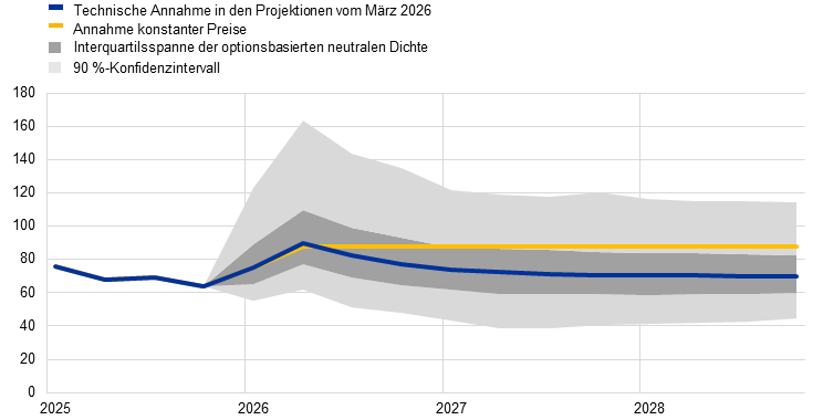 Die Wirtschaft des Euroraums blieb 2025 trotz Unsicherheit und handelspolitischer Schocks widerstandsfähig. Die Wachstumserwartungen wurden im Verlauf des vergangenen Jahres immer wieder nach oben revidiert, und die Wirtschaft behielt diese positive Dynamik bis Anfang 2026 weitgehend bei. Der Krieg im Nahen Osten hat jedoch zu neuerlicher Unsicherheit geführt, und die wirtschaftlichen Aussichten sind wieder eingetrübt. Auf den globalen Energiemärkten hat die Behinderung der Schifffahrt durch die Straße von Hormus, einer wichtigen Route für den weltweiten Handel mit Erdöl und Flüssigerdgas, zusammen mit den Angriffen auf die Energieinfrastruktur zu erheblichen Schwankungen geführt und die Öl- und Gaspreise in die Höhe getrieben. Das Basisszenario der Projektionen stützt sich auf die Entwicklung der Terminpreise für Energierohstoffe zum Stichtag 11. März 2026.[1] Diese lassen darauf schließen, dass die Durchschnittspreise von Öl und Gas im zweiten Quartal 2026 mit rund 90 USD je Barrel bzw. 50 € je MWh ihren Höchststand erreichen und dann in den folgenden Quartalen zurückgehen werden. In Übereinstimmung mit diesen Annahmen geht das Basisszenario von einem Anstieg der Inflation aus, was vor allem auf kurze Sicht die Kaufkraft, die Konsumausgaben und damit das BIP-Wachstum dämpfen wird. Nichtsdestotrotz bleibt höchst unsicher, wie sich der Konflikt entwickeln und auf die Energiepreise, die Unsicherheit und auf das Vertrauen auswirken wird. Ebenso ungewiss ist das Durchwirken der Energiepreisschocks auf die Verbraucherpreise ohne Energie. Daher werden die Basisprojektionen um alternative, hypothetische Szenarien ergänzt, die von unterschiedlich starken wirtschaftlichen Auswirkungen des Konflikts auf den Euroraum ausgehen.