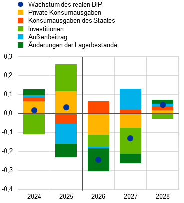 Vor dem Hintergrund, dass sich die Binnennachfrage aufgrund der zugrunde liegenden Annahme eines kurzfristigen Schocks in den Energieterminkontrakten erholt und dass sich der negative Beitrag der Nettoexporte 2027 geringfügig ins Positive kehrt, wird sich das jährliche Wachstum des realen BIP den Projektionen zufolge auf mittlere Sicht von 0,9 % im Jahr 2026 auf 1,3 % im Jahr 2027 und auf 1,4 % im Jahr 2028 erhöhen (siehe Abbildung 2 und Tabelle 2). Der leichte Rückgang des jährlichen Wachstums von 1,5 % im Jahr 2025 auf 0,9 % im Jahr 2026 spiegelt sowohl eine schwächere Dynamik im Jahresverlauf als auch einen geringeren statistischen Überhang wider. Auf der Ausgabenseite wird davon ausgegangen, dass die privaten Konsumausgaben – ergänzt durch eine starke Investitionsdynamik – weiterhin den größten Wachstumsbeitrag leisten.