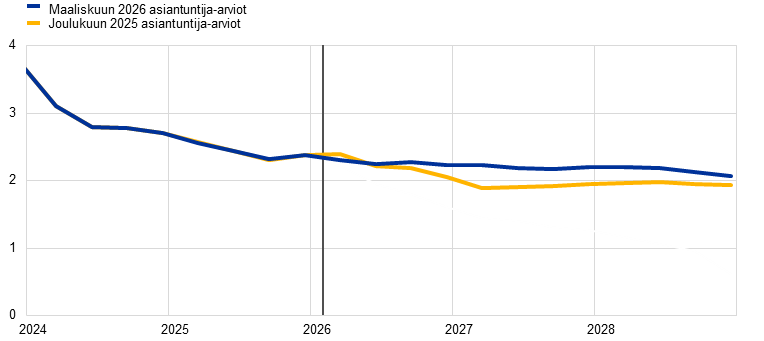 Viime vuoden lopulla euroalueen talous kasvoi 0,2 % eli joulukuun asiantuntija-arvioiden mukaisesti. Kasvu sai tukea kulutuksen ja julkisten investointien vahvistumisesta. Lyhyen aikavälin indikaattorien mukaan kasvuvire jatkui vuoden 2026 kahden ensimmäisen kuukauden aikana. Lyhyen aikavälin kasvunäkymiä on tarkistettu kuitenkin alaspäin Lähi-idän sodan vuoksi, sillä energian hintasokit ja epävarmuuden lisääntyminen todennäköisesti vaimentavat kulutusta ja investointeja. Kasvun hidastuminen jäänee tilapäiseksi, jos energiahinnat laskevat suhteellisen nopeasti energiaraaka-aineiden futuurimarkkinahintoja noudatellen ja jos epävarmuuskin vähenee suhteellisen ripeään tahtiin. Kotimainen kysyntä lienee edelleen tärkein euroalueen talouskasvua keskipitkällä aikavälillä vauhdittava tekijä. Kasvu saa tukea myös vahvoista työmarkkinoista sekä julkisten infrastruktuuri- ja puolustusmenojen lisäyksistä etenkin Saksassa. Viennin kasvun odotetaan piristyvän ulkomaisen kysynnän kohenemisen myötä, mutta euroalueen maailmanmarkkinaosuuksien supistuminen todennäköisesti jatkuu sitkeiden, osittain rakenteellistenkin kilpailukykyhaasteiden vuoksi ja huolimatta siitä, että Yhdysvaltoihin suuntautuvan viennin tullit ovat jonkin verran alemmat kuin joulukuun asiantuntija-arvioiden aikaan. Asiantuntija-arvioiden perusskenaarion mukaan euroalueen BKT kasvaa 0,9 % vuonna 2026, 1,3 % vuonna 2027 ja 1,4 % vuonna 2028. Lähi-idän sodan laajenemisen vuoksi BKT:n kasvuarvioita on tarkistettu alaspäin. Joulukuun 2025 asiantuntija-arvioihin nähden tarkistus on 0,3 prosenttiyksikköä vuonna 2026 ja 0,1 prosenttiyksikköä vuonna 2027. Vuotta 2028 koskeva arvio pysyy ennallaan.