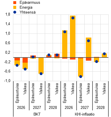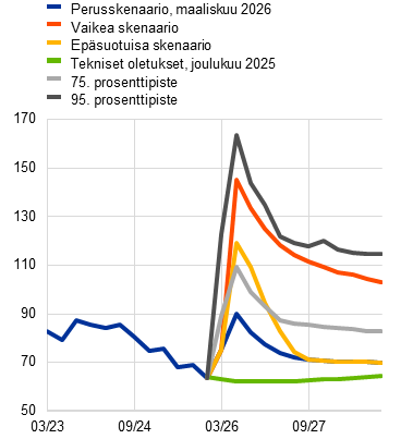 Lisäksi asiantuntijat ovat laatineet joitakin 4.3.2025 koottuihin teknisiin oletuksiin perustuvia arvioita (joihin sisältyvät tiedot Lähi-idän sodan alkamisen jälkeiseltä kolmelta ensimmäiseltä työpäivältä). Niissä näkymät ovat suotuisammat: vuoden 2026 toisella neljänneksellä öljyn hinnan oletetaan olevan korkeimmillaan 79 Yhdysvaltain dollaria barrelilta ja kaasun hinnan 48 euroa megawattitunnilta.[2] Näissä suotuisammissa arvioissa vuoden 2026 inflaatio on 0,3 prosenttiyksikköä hitaampi ja vuosien 2027 ja 2028 inflaatio 0,1 prosenttiyksikköä hitaampi kuin lopullisessa perusskenaariossa. Talouskasvu on puolestaan kunakin arviointijakson vuotena 0,1 prosenttiyksikköä nopeampi kuin lopullisessa perusskenaariossa.