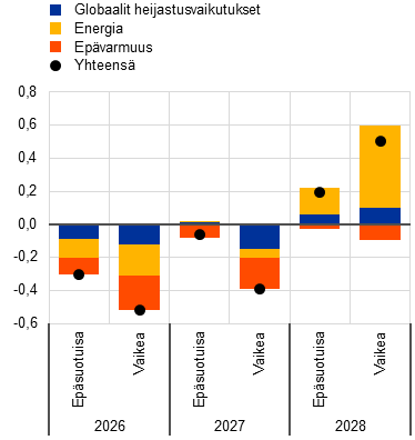 Perusskenaarion lisäksi asiantuntijat ovat laatineet hypoteettisia vaihtoehtoskenaarioita, joissa on erilaisia oletuksia energian hintasokin voimakkuudesta ja kestosta, hintasokin vaikutuksesta kansainväliseen toimintaympäristöön ja epävarmuuteen sekä sen leviämisestä välillisten vaikutusten ja kerrannaisvaikutusten kautta. Vaihtoehtoskenaarioissa on havainnollisia esimerkkejä energiaraaka-aineiden hintojen mahdollisista kehityskuluista ja niiden välittymisestä euroalueen talouteen. Asiantuntijat eivät määritä skenaarioille todennäköisyyksiä vaan skenaarioiden tarkoituksena on pikemminkin korostaa konfliktin vaikutuksiin liittyviä keskeisiä epävarmuustekijöitä. Kuten yleensäkin asiantuntija-arvioissa, skenaariot havainnollistavat vaikutuksia, joita euroalueen talouteen voi kohdistua, jos viranomaiset eivät ryhdy perusskenaarioon sisältyvien toimien lisäksi muihin raha- tai finanssipoliittisiin toimiin. Epäsuotuisaan skenaarioon sisältyy perusskenaariota voimakkaampia välillisiä vaikutuksia ja kerrannaisvaikutuksia, joiden tarkoituksena on tuoda esiin mahdollista epälineaarisuutta siinä, miten energian alkuperäinen hintasokki leviää muihin hintoihin taloudessa. Siinä oletetaan energiahintojen nousevan paljon jyrkemmin kuin perusskenaariossa. Lisäksi siinä oletetaan, että epävarmuus ja haitalliset kansainväliset heijastusvaikutukset (kuten ulkomaisen kysynnän väheneminen) kasvavat. Vuoden 2026 toisella neljänneksellä öljyn hinnan oletetaan olevan korkeimmillaan 119 Yhdysvaltain dollaria barrelilta ja kaasun 87 dollaria megawattitunnilta, ja hintojen oletetaan lähestyvän perusskenaarion oletuksia vuoden 2027 kolmanteen neljännekseen mennessä. Perusskenaarioon verrattuna epäsuotuisassa skenaariossa inflaatio on 0,9 prosenttiyksikköä nopeampi vuonna 2026 ja 0,1 prosenttiyksikköä nopeampi vuonna 2027 mutta 0,5 prosenttiyksikköä hitaampi vuonna 2028, jolloin energiahintojen oletetaan normalisoituvan nopeasti ja luovan inflaatioon hidastumispainetta. Talouskasvu on sen sijaan hitaampaa kuin perusskenaariossa vuosina 2026 ja 2027 mutta sitä nopeampaa vuonna 2028. Vaikeassa skenaariossa oletetaan, että energian hintasokki on voimakkaampi ja pitkäaikaisempi, epävarmuus on suurempaa ja välilliset ja kerrannaisvaikutukset voimakkaampia kuin epäsuotuisassa skenaariossa. Vaikeassa skenaariossa öljyn hinnan oletetaan olevan korkeimmillaan 145 Yhdysvaltain dollaria barrelilta ja kaasun hinnan 106 euroa megawattitunnilta vuoden 2026 toisella neljänneksellä. Sen jälkeen näiden hintojen oletetaan laskevan paljon hitaammin ja pysyvän arviointijakson loppuun asti huomattavasti korkeampina kuin perusskenaariossa ja epäsuotuisassa skenaariossa. Vaikeassa skenaariossa kokonaisinflaatio on koko arviointijakson ajan huomattavasti ja sitkeästi nopeampaa kuin perusskenaariossa (1,8 prosenttiyksikköä vuonna 2026, ja 2,8 prosenttiyksikköä vuonna 2027 sekä 0,7 prosenttiyksikköä vuonna 2028). Taulukosta 1 käy ilmi merkittävä ero epäsuotuisan skenaarion (1,6 %) ja vaikean skenaarion (2,8 %) mukaisen inflaation välillä vuonna 2028. Tämä osoittaa, että konfliktin kehittymisellä, energian toimitushäiriöillä ja hintasokin välittymismekanismien koolla on suuri merkitys määritettäessä konfliktin vaikutusta keskipitkän aikavälin inflaatioon. Vuosina 2026–2027 talouskasvu olisi 0,4–0,5 prosenttiyksikköä hitaampaa kuin perusskenaariossa, minkä jälkeen se vahvistuisi ja olisi 0,5 prosenttiyksikköä perusskenaariota nopeampaa vuonna 2028. Talouden oletetaan siis kasvavan voimakkaammin arviointijakson loppua kohti, sillä tulojen ja kysynnän kasvun oletetaan vahvistuvan, kun edellisinä vuosina nopeutunut inflaatio johtaa palkkojen kasvuun.