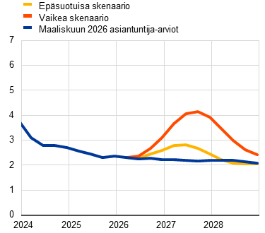 Yhdenmukaistetulla kuluttajahintaindeksillä (YKHI) mitatun inflaation arvioidaan nopeutuvan jyrkästi 3,1 prosenttiin vuoden 2026 toisella neljänneksellä, sillä Lähi-idän kriisi nopeuttaa voimakkaasti energian hintainflaatiota. Kolmannella vuosineljänneksellä inflaation arvioidaan hidastuvan 2,8 prosenttiin, koska energiaraaka-aineiden hintojen oletetaan laskevat futuurihintojen laskun myötä. Asiantuntija-arvioiden perusskenaarion mukaan energian hintainflaatio muuttuu negatiiviseksi vuonna 2027 pääasiassa energian hintakehitykseen liittyvien vertailuajankohdan vaikutusten vuoksi. Energiainflaation arvioidaan nopeutuvan huomattavasti vuonna 2028, jolloin EU:n ETS2-päästökauppajärjestelmän (ETS2) käyttöönoton odotetaan nopeuttavan kokonaisinflaatiota 0,2 prosenttiyksikköä. Elintarvikkeiden hintainflaation arvioidaan nopeutuvan vuoden 2026 lopulta lähtien, kun energian hintapiikkien aiheuttamat kustannuspaineet välittyvät elintarvikkeiden kuluttajahintoihin. Vuonna 2028 sen arvioidaan vaimenevan. Energian ja elintarvikkeiden hinnoista puhdistetun YKHI-inflaation arvioidaan maltillistuvan siten, että se on 2,4 % vuonna 2025 ja 2,1 % vuonna 2028. Energiahintojen noususta johtuvat kustannuspaineet vaikuttavat myös tähän YKHI-inflaatioon, mutta työvoimakustannuspaineiden lievän vähenemisen, euron aiemman vahvistumisen ja Kiinan tuonnin penetraation arvioidaan vaimentavan tätä vaikutusta. Perusskenaarion mukaan YKHI-inflaatio ensin nopeutuu vuoden 2025 aikaisesta 2,1 prosentista 2,6 prosenttiin vuonna 2026. Sitten se hidastuu 2,0 prosenttiin vuonna 2027 ja nopeutuu jälleen vuonna 2028, jolloin sen arvioidaan olevan 2,1 %. Palkkojen kasvu maltillistuu tulevina vuosina, tosin edellisissä asiantuntija-arvioissa ennakoitua hitaammin. Maltillisemman kasvun syynä ovat energian hintasokkiin liittyvän inflaatiokompensaation vaikutukset. Joulukuun 2025 asiantuntija-arvioihin verrattuna kokonaisinflaation näkymiä on tarkistettu 0,7 prosenttiyksikköä ylöspäin vuodelle 2026 lähinnä kokonaisinflaation energiaerän vuoksi. Arviota energiaerän kehityksestä on tarkistettu ylöspäin 0,2 prosenttiyksikköä vuodelle 2027 ja 0,1 prosenttiyksikköä vuodelle 2028. Syynä on energiahintojen noususta johtuvien kustannuspaineiden välittyminen energian ja elintarvikkeiden hinnoista puhdistettuun YKHI-inflaatioon ja elintarvike-eriin. Energiaerän kehitystä koskevia arvioita on tarkistettu sen sijaan jonkin verran alaspäin.