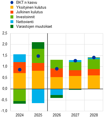 Keskipitkällä aikavälillä BKT:n vuotuisen kasvun arvioidaan nopeutuvan siten, että se on 0,9 % vuonna 2026 ja 1,3 % vuonna 2027 sekä 1,4 % vuonna 2028, kun kotimainen kysyntä elpyy energian futuurihintoihin sisältyvän lyhytaikaisen sokin taustaoletuksen mukaisesti ja kun nettoviennin negatiivinen vaikutus muuttuu aavistuksen positiiviseksi vuonna 2027 (ks. kuvio 2 ja taulukko 2). BKT:n vuotuisen kasvun hidastuminen vuosien 2025 ja 2026 välillä 1,5 prosentista 0,9 prosenttiin johtuu sekä vuodensisäisen kasvun heikkenemisestä että pienemmästä kasvuperinnöstä. Yksityisen kulutuksen arvioidaan olevan edelleen tärkein kasvua vauhdittava tekijä, jonka vaikutusta investointien vahva kehitys täydentää.