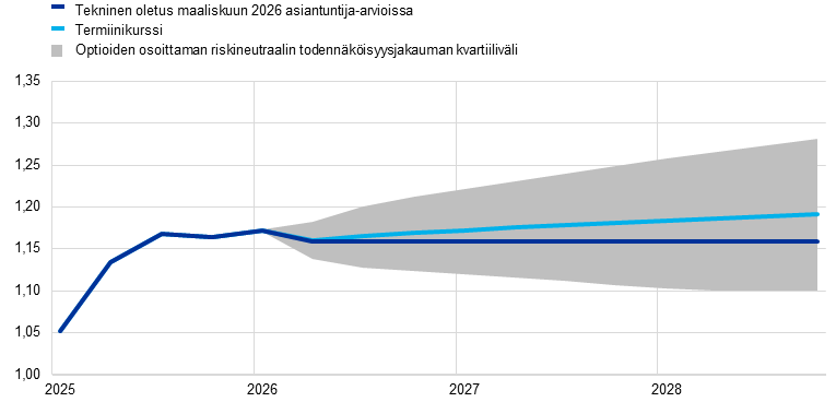 Valuuttakurssien vaihtoehtoiset kehitysurat viittaavat siihen, että euro saattaa vahvistua entisestään etenkin keskipitkällä aikavälillä, mikä merkitsisi ennakoitua hitaamman talouskasvun ja inflaation riskejä. Asiantuntija-arvioiden perusskenaarion teknisissä oletuksissa valuuttakurssin kehitys on vakioitu koko arviointijakson ajaksi. Kaksi vaihtoehtoista valuuttakurssikehitystä, jotka on johdettu 11.3.2026 päivättyjen Yhdysvaltain dollarin ja euron välisten valuuttakurssioptioiden riskineutraalin todennäköisyysjakauman ala- ja yläkvartiileista, viittaavat euron kurssin lievään vahvistumiseen (ks. kuvio 17). Vaihtoehtoisten kehitysurien vaikutuksia arvioidaan EKP:n ja eurojärjestelmän asiantuntijoiden käyttämillä makrotalousmalleilla. Taulukosta 7 käy ilmi eri malleilla saatujen tulosten keskimääräinen vaikutus kokonaistuotannon kasvuun ja inflaatioon.
