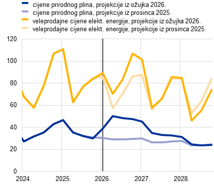 Predviđa se da će inflacija mjerena harmoniziranim indeksom potrošačkih cijena (HIPC) u drugom tromjesečju 2026. naglo porasti na 3,1 % potaknuta naglim rastom inflacije cijena energije zbog krize na Bliskom istoku te da će se zatim u trećem tromjesečju smanjiti na 2,8 % nakon smanjenja cijena energenata ugrađenih u terminske cijene. U osnovnim se projekcijama predviđa da će inflacija cijena energije postati negativna u 2027. uglavnom zbog negativnih baznih učinaka te se znatno povećati u 2028. zbog provedbe sustava EU‑a za trgovanje emisijama 2 (ETS2), čiji bi pozitivni utjecaj na ukupnu inflaciju trebao iznositi 0,2 postotna boda. Predviđa se da će inflacija cijena hrane prvo rasti od kraja 2026. kako se troškovni pritisci koji proizlaze iz naglog porasta cijena energije budu prenosili na potrošačke cijene hrane te da će se potom smanjiti u 2028. Inflacija mjerena HIPC‑om bez energije i hrane trebala bi se smanjiti s 2,4 % u 2025. na 2,1 % u 2028. Iako na inflaciju mjerenu HIPC‑om bez energije i hrane utječu i troškovni pritisci koji proizlaze iz viših cijena energije, smatra se da njih donekle neutraliziraju slabljenje pritisaka troškova rada, prethodna aprecijacija eura i prodor uvoza iz Kine. Općenito gledajući, u osnovnim projekcijama predviđa se da će se inflacija mjerena HIPC‑om povećati s 2,1 % u 2025. na 2,6 % u 2026. te da će se potom smanjiti na 2,0 % u 2027. i porasti na 2,1 % u 2028. Rast plaća smanjivat će se u sljedećim godinama, iako sporije nego što je predviđeno u prethodnim projekcijama zbog određenih učinaka naknada za inflaciju povezanih sa šokom cijena energije. U odnosu na projekcije iz prosinca 2025. izgledi za ukupnu inflaciju mjerenu HIPC‑om revidirani su naviše za 0,7 postotnih bodova za 2026. uglavnom zbog komponente energije. Revidirani su naviše za 0,2 postotna boda za 2027. i za 0,1 postotni bod za 2028. jer se troškovni pritisci koji proizlaze iz viših cijena energije prenose na inflaciju mjerenu HIPC‑om bez energije i hrane te na komponente hrane a komponenta energije revidirana je malo naniže.