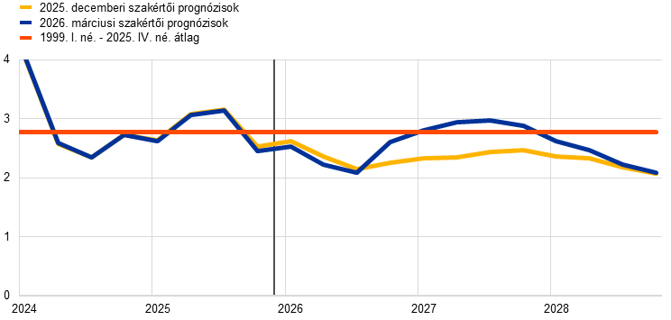 Megjegyzések: A múltbeli adatok eltérhetnek az Eurostat legutóbbi kiadványaitól. A függőleges vonal jelzi az aktuális előrejelzési időszak kezdetét. Az ábrán nem láthatók a prognózist övező bizonytalansági sávok. Ez annak tudható be, hogy a legyezőábrák (múltbeli előrejelzési hibákon alapuló) standard számítása a jelen körülmények között nem jelezné megbízhatóan a mostani prognózist övező, nagy bizonytalanságot. A jelenlegi bizonytalanság jobb szemléltetése érdekében inkább olyan alternatív forgatókönyveket mutatunk be a 3. pontban, amelyek a közel-keleti háború gazdasági hatása tekintetében különböző súlyosságot feltételeznek.