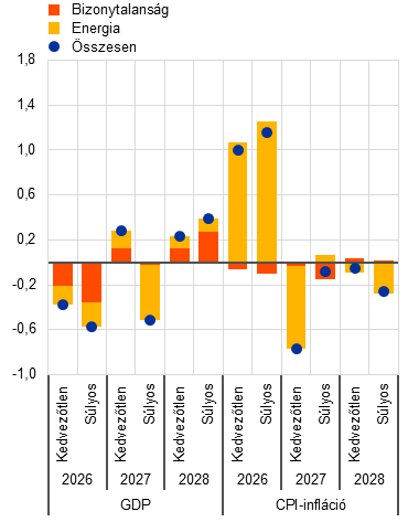 Végezetül, a technikai feltevéseken alapuló, március 4-i zárónapú prognóziscsomag (a közel-keleti háború kezdetét követő első három munkanapra vonatkozó információkkal együtt) kedvezőbb kilátásokat tükröznek, ahogy az olaj- és gázárak várhatóan hordónként 79 USD-n, illetve 48 EUR/MWh-n tetőznek 2026 második negyedévében.[2] Az említett előrejelzésekkel összhangban az infláció 2026-ban 0,3 százalékponttal elmaradna a végleges alapprognózistól, 2027-ben és 2028-ban pedig 0,1 százalékponttal lenne alacsonyabb, míg a növekedés az előrejelzési időszak minden évében 0,1 százalékponttal magasabb lenne.