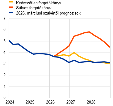 A szakértők az alapprognózisok mellett alternatív, hipotetikus forgatókönyveket is készítettek, amelyek eltérő feltevésekkel élnek az energiaársokk mértéke és tartóssága, a nemzetközi környezetre és bizonytalanságra gyakorolt hatása, valamint a közvetett és másodlagos hatásokon keresztül terjedő inflációs hatás tekintetében. Ezek a forgatókönyvek szemléltető példákkal szolgálnak az energiahordozó-árak alternatív pályáiról és hatásaik euroövezeti gazdaságba történő átgyűrűzéséről. A szakértők nem rendelnek valószínűségeket ezekhez a forgatókönyvekhez, amelyek inkább arra szolgálnak, hogy rávilágítsanak a konfliktus hatásával kapcsolatos főbb bizonytalanságokra. A szakértői prognózisok esetében bevett gyakorlathoz hasonlóan ezek a forgatókönyvek az euroövezeti gazdaságra gyakorolt hatásokat szemléltetik az alapprognózisban foglaltakon túlmutató, nem monetáris vagy fiskális politikai reakció hiányában. A kedvezőtlen forgatókönyv az alapprognózishoz képest erősebb közvetett és másodlagos hatásokat foglal magában, hogy a kezdeti energiaársokknak a gazdaságon belüli egyéb árakra való átterjedése során megragadja a lehetséges nem lináris tényezőket. Az energiaárak sokkal meredekebb emelkedését, valamint a bizonytalanság fokozódását és a kedvezőtlen nemzetközi tovagyűrűző hatásokat (például a külső kereslet csökkenését) feltételezi. Az olaj-, illetve a gázár feltehetőleg hordónként 119 USD-n, illetve 87 EUR/MWh-n tetőz 2026 második negyedévében, majd 2027 harmadik negyedévéig közelít az alapfeltevésekhez. Az alapprognózishoz képest a kedvezőtlen forgatókönyv azt jelzi, hogy az infláció 2026-ban 0,9 százalékponttal, 2027-ben pedig 0,1 százalékponttal magasabb, 2028-ban viszont 0,5 százalékponttal alacsonyabb lehet az energiaárak az évi gyors normalizálódásából eredő dezinflációs nyomás miatt. Ezzel szemben a gazdasági növekedés 2026-ban és 2027-ben alacsonyabb, 2028-ban viszont magasabb lenne az alapprognózisnál. A kedvezőtlen forgatókönyvhöz képest a súlyos forgatókönyv erősebb és tartósabb energiaársokkot, nagyobb bizonytalanságot, valamint még erősebb közvetett és másodlagos hatásokat feltételez. Az olajárak a feltevés szerint 2026 második negyedévében hordónként 145 USD-n, a gázárak pedig 106 EUR/MWh-n tetőznek, majd az előrejelzési időszak hátralevő részében sokkal lassabb ütemben csökkennek, és jelentősen meghaladják mind az alapprognózisban, mind a kedvezőtlen forgatókönyvben foglalt feltevéseket. Az alapforgatókönyvhöz képest a teljes infláció jelentősen és tartósan magasabb lenne az előrejelzési időszakban (1,8 százalékponttal 2026-ban, 2,8 százalékponttal 2027-ben és 0,7 százalékponttal 2028-ban). A 2028-as inflációnak a kedvezőtlen forgatókönyv (1,6%) és a súlyos forgatókönyv (2,8%) közötti jelentős különbsége – amint azt az 1. táblázat mutatja – rávilágít a konfliktus alakulásának, az energiaellátás zavarainak és a sokk által kiváltott terjesztési mechanizmusok méretének kulcsszerepére az inflációra gyakorolt középtávú hatás meghatározásában. A gazdasági növekedés 2026–27-ben 0,4–0,5 százalékponttal lenne alacsonyabb, majd 2028-ban 0,5 százalékponttal az alapprognózis fölé emelkedne. Az előrejelzési időszak vége felé élénkülő növekedés a jövedelmek és a kereslet feltételezett bővülését tükrözi, amely abból ered, hogy az előző években az infláció emelkedését követően a bérek felfelé reagálnak.