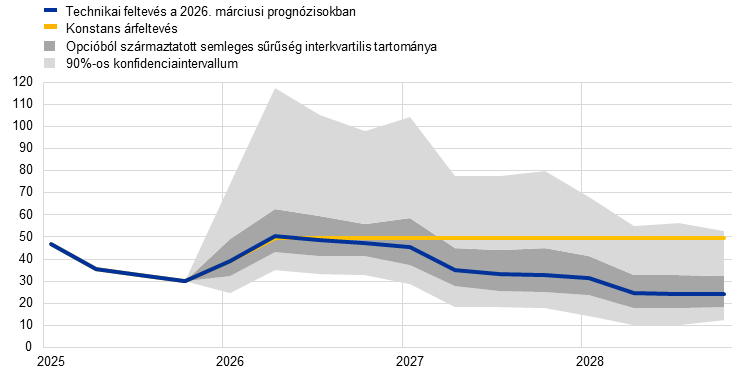 1. A technikai feltevések 2026. március 11-i zárónapja két nappal a prognózis véglegesítése elé esett, ami szokatlanul közel van a Kormányzótanács monetáris politikai értekezletéhez, tekintettel a rendkívüli geopolitikai fejleményekre és a gyorsan változó helyzettel kapcsolatos információk beépítésének szükségességére. Ezek a feltevések a zárónapot megelőző három nap piaci adatainak átlagán alapulnak. Ez az időkeret szűkebb, mint a szakértői prognózishoz általában használt tíz nap, tehát csak a közel-keleti háború kitörését követő adatokat vettük figyelembe. A nemzetközi környezetre vonatkozó prognózist március 11-én, az euroövezetre vonatkozó prognózist pedig 2026. március 13-án véglegesítettük. Mivel a prognózis véglegesítésére korlátozott idő állt rendelkezésre, a prognózisban általában szereplő részletes változók közül néhányat nem lehetett meghatározni.