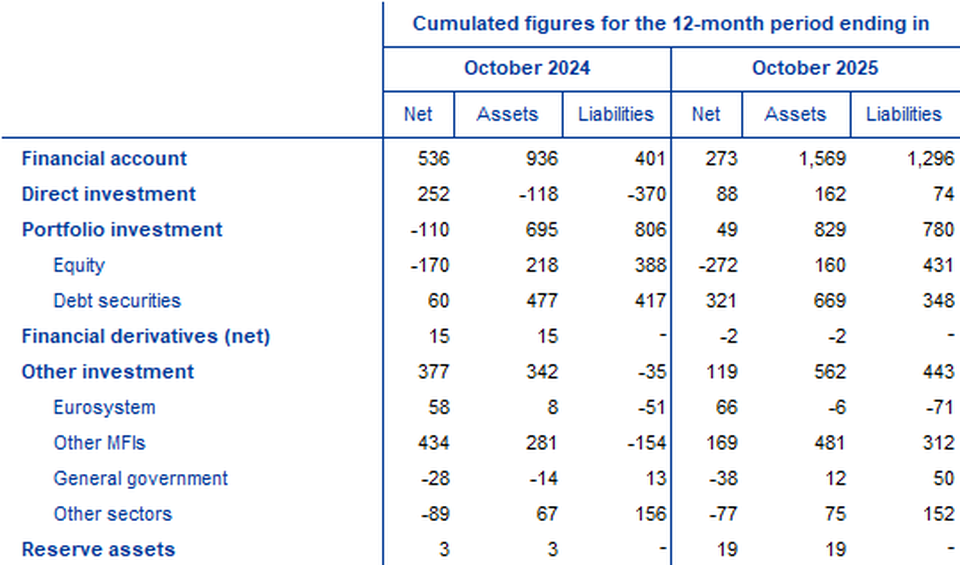 - In financial account, euro area residents’ net acquisitions of non-euro area portfolio investment securities totalled €829 billion and non-residents’ net acquisitions of euro area portfolio investment securities totalled €780 billion in the 12 months to October 2025
