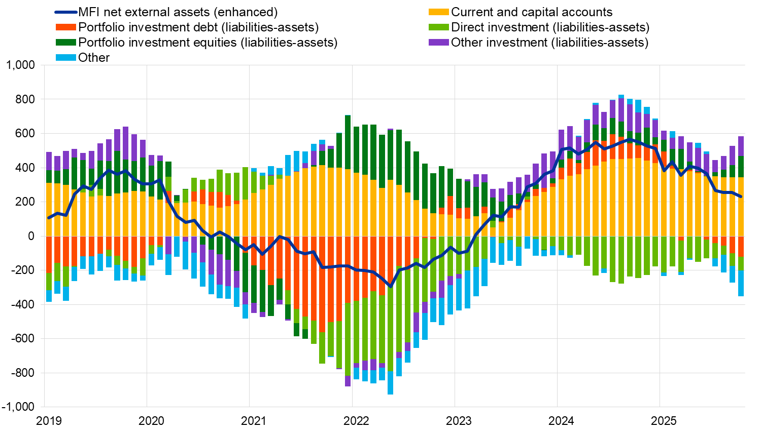 The monetary presentation of the balance of payments (Chart 3) shows that the net external assets (enhanced) of euro area MFIs increased by €230 billion in the 12 months to October 2025. This increase was driven by the current and capital accounts surplus and euro area non-MFIs’ net inflows in portfolio investment equity and other investment. These developments were partly offset by euro area non-MFIs’ net outflows in other flows, portfolio investment debt and direct investment.