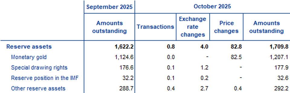 In October 2025, the Eurosystem’s stock of reserve assets increased to €1,709.8 billion up from €1,622.2 billion in the previous month (Table 3). This increase was mostly driven by positive price changes (€82.8 billion), due to an increase in the price of gold, and, to a lesser extent, by positive exchange rate changes (€4.0 billion) and net acquisitions of assets (€0.8 billion).