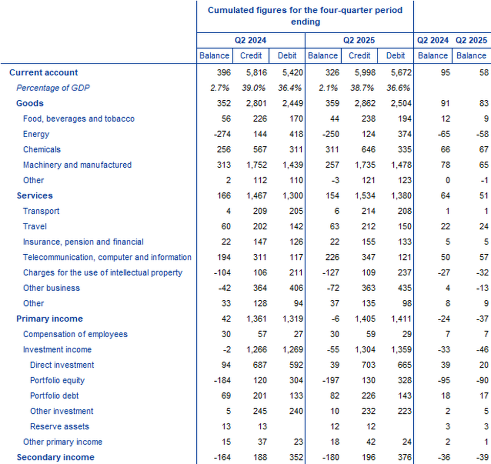 The current account of the euro area recorded a surplus of €326 billion (2.1% of euro area GDP) in the four quarters to the second quarter of 2025, following a €396 billion surplus (2.7% of GDP) a year earlier (Table 1). This decrease was mainly driven by a shift in the balance for primary income from a surplus (€42 billion) to a deficit (€6 billion) and, to a lesser extent, by a wider deficit for secondary income (from €164 billion to €180 billion) as well as a lower surplus for services (from €166 billion to €154 billion). These developments were partly offset by a larger surplus for goods (from €352 billion to €359 billion).