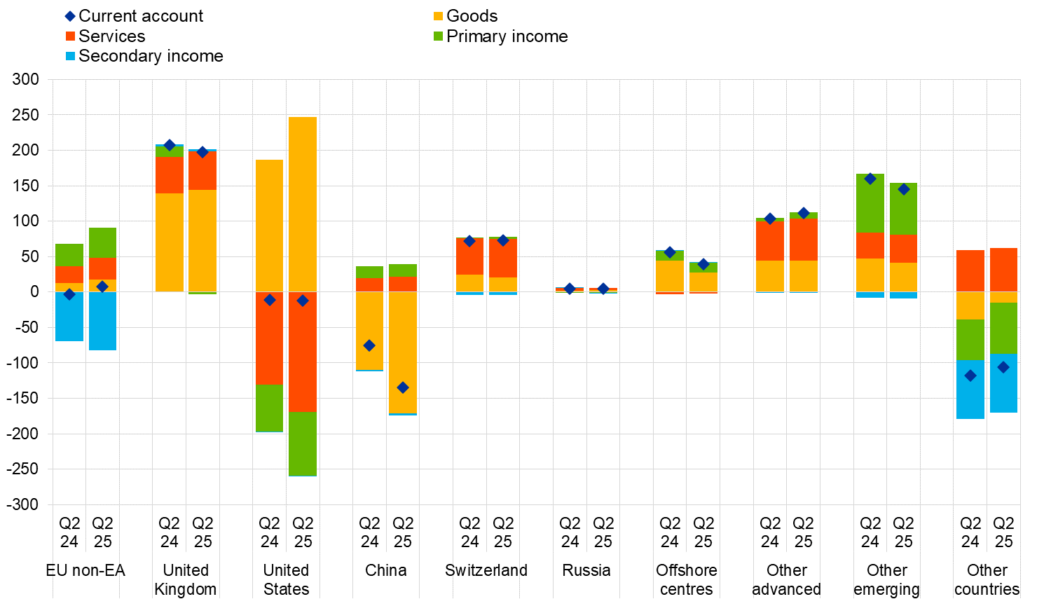 The most significant changes in the current account components by geographical counterpart over the four quarters ending in the second quarter of 2025 relative to the previous year were as follows: in goods, the surplus vis-à-vis the United States increased from €186 billion to €247 billion, while the deficit vis-à-vis China widened from €110 billion to €172 billion. In services, the deficit vis-à-vis the United States increased from €131 billion to €169 billion, while the surplus vis-à-vis EU Member States and EU institutions outside the euro area increased from €23 billion to €31 billion. In primary income, the deficit vis-à-vis the United States increased from €66 billion to €90 billion, while in secondary income the deficit vis-à-vis EU Member States and EU institutions outside the euro area increased from €70 billion to €82 billion.