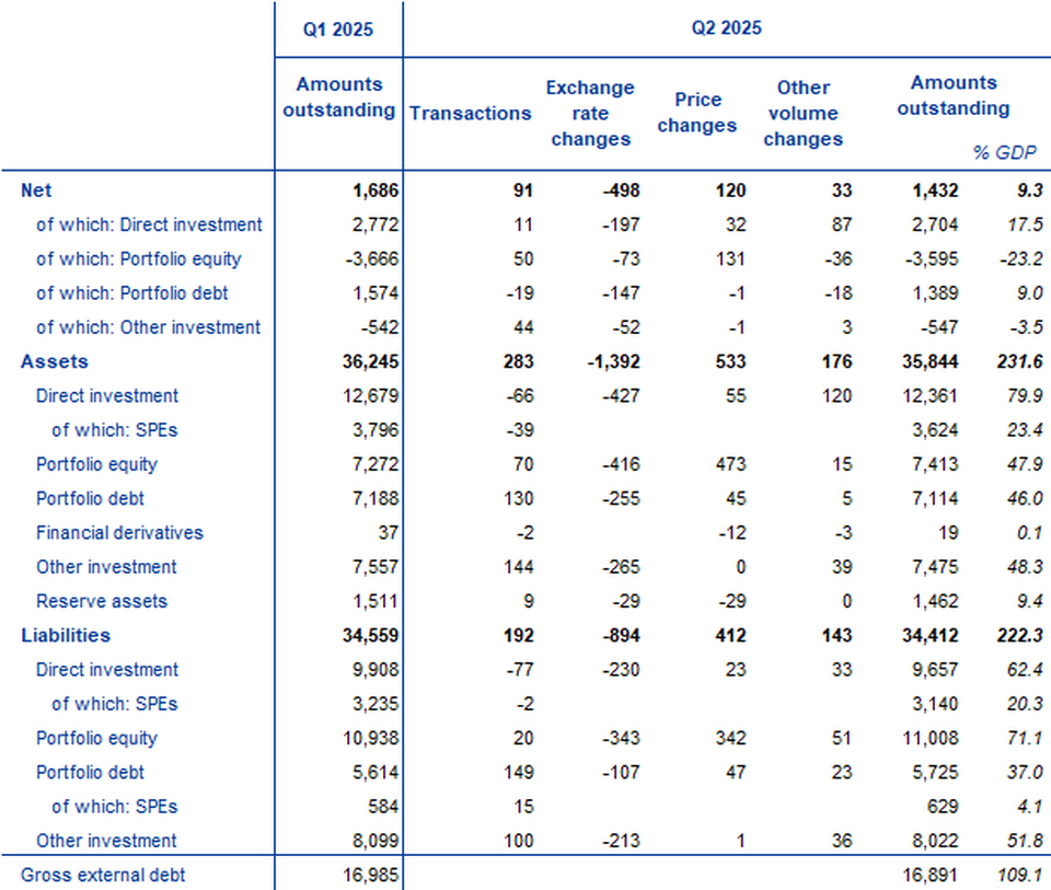 • International investment position showed net assets of €1.43 trillion (9.3% of euro area GDP) at end of second quarter of 2025