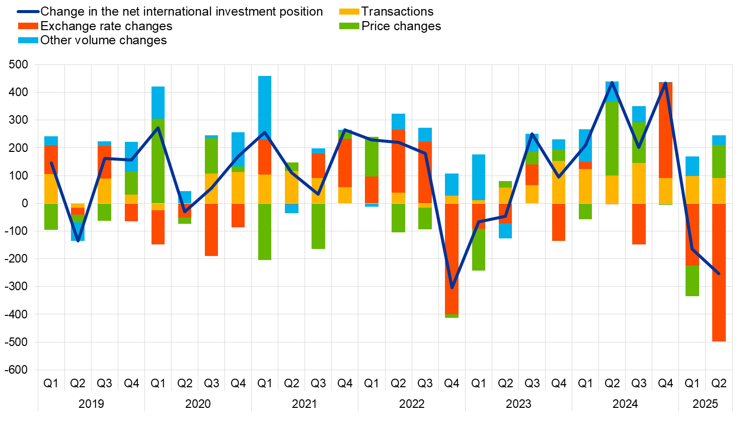 The developments in the euro area’s net international investment position in the second quarter of 2025 were driven mainly by negative exchange rate changes (€498 billion), which were partly offset by positive price changes (€120 billion), transactions (€91 billion) and other volume changes (€33 billion) (Table 2 and Chart 3).