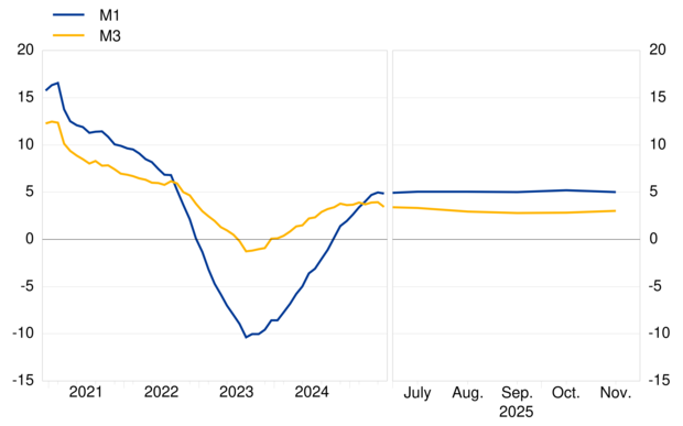 The annual growth rate of the broad monetary aggregate M3 increased to 3.0% in November 2025 from 2.8% in October, averaging 2.9% in the three months up to November. The components of M3 showed the following developments. The annual growth rate of the narrower aggregate M1, which comprises currency in circulation and overnight deposits, decreased to 5.0% in November from 5.2% in October. The annual growth rate of short-term deposits other than overnight deposits (M2-M1) was ‑0.8% in November, compared with -1.8% in October. The annual growth rate of marketable instruments (M3-M2) increased to 1.6% in November from 1.4% in October.