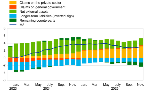 The annual growth rate of M3 in November 2025, as a reflection of changes in the items on the monetary financial institution (MFI) consolidated balance sheet other than M3 (counterparts of M3), can be broken down as follows: claims on the private sector contributed 3.2 percentage points (up from 2.7 percentage points in October), net external assets contributed 1.9 percentage points (up from 1.7 percentage points), claims on general government contributed 0.3 percentage points (up from 0.2 percentage points), longer-term liabilities contributed -1.2 percentage points (down from -1.0 percentage points), and the remaining counterparts of M3 contributed -1.1 percentage points (down from -0.9 percentage points).