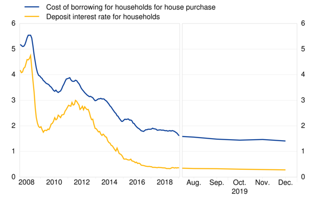 As regards new deposit from households, the interest rate on deposits with an agreed maturity of up to one year remained broadly unchanged at 0.21% in December 2019. The interest rate on deposits redeemable at three months' notice and on overnight deposits showed no change, at 0.42% and 0.03%, respectively.