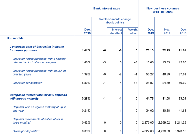 - The composite interest rate for new deposits with agreed maturity from households remained broadly unchanged at 0.28% in December 2019.
