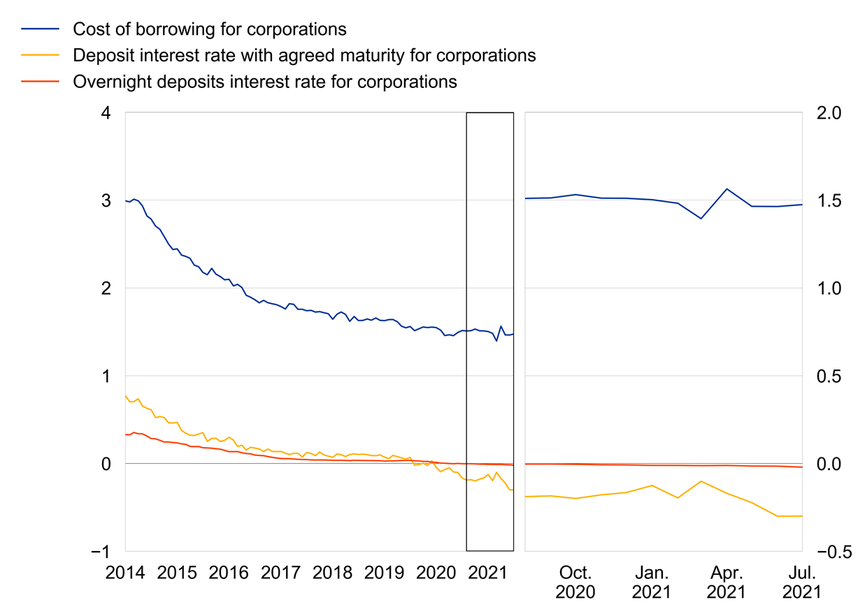 As regards new deposit agreements, the interest rate on deposits from corporations with an agreed maturity of up to one year stayed constant at -0.31% in July 2021. The interest rate on overnight deposits from corporations stayed almost constant at -0.02%.