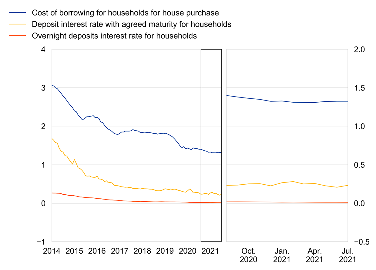 The composite cost-of-borrowing indicator, which combines interest rates on all loans to households for house purchase, showed no change in July 2021. The interest rate on loans for house purchase with a floating rate and an initial rate fixation period of up to one year and the one on housing loans with an initial rate fixation period of over one and up to five years remained broadly unchanged at 1.35% and 1.45%, respectively. The rate on loans for house purchase with an initial rate fixation period of over five and up to ten years stayed almost constant at 1.27%. The interest rate on housing loans with an initial rate fixation period of over ten years showed no change at 1.30%. In the same period the interest rate on new loans to households for consumption rose by 9 basis points to 5.25%, driven by both the interest rate and the weight effects.