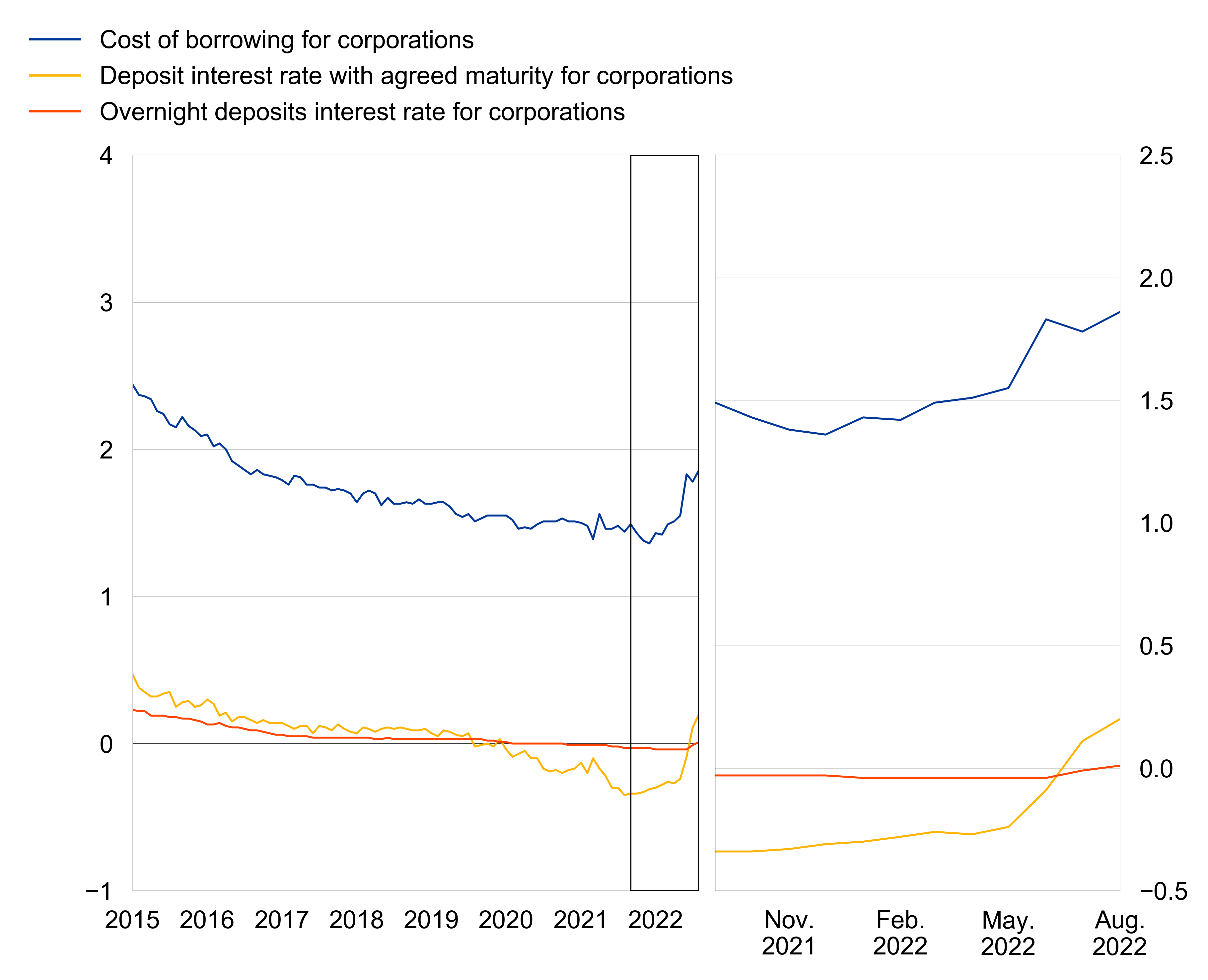 As regards new deposit agreements, the interest rate on deposits from corporations with an agreed maturity of up to one year rose by 12 basis points to 0.13% in August 2022, driven by the interest rate effect. The interest rate on overnight deposits from corporations stayed almost constant at 0.01%.