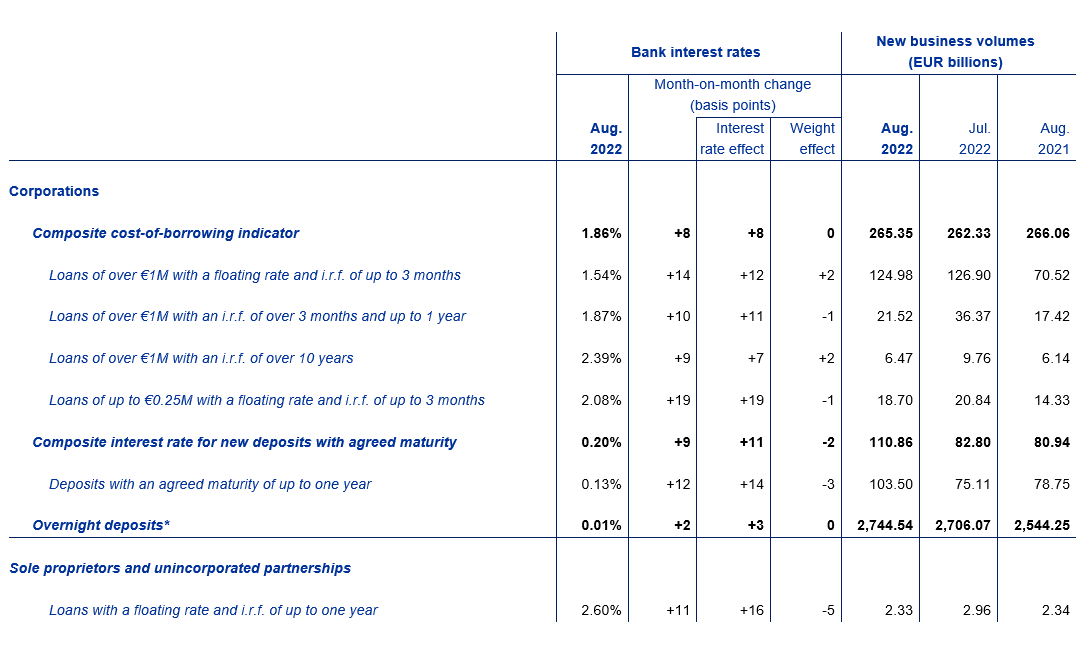 The composite cost-of-borrowing indicator, which combines interest rates on all loans to corporations, increased, driven by the interest rate effect in August 2022. The interest rate on new loans of over €1 million with a floating rate and an initial rate fixation period of up to three months increased by 14 basis points to 1.54%, mainly driven by the interest rate effect. The rate on new loans of the same size with an initial rate fixation period of over three months and up to one year rose by 10 basis points to 1.87%, driven by the interest rate effect. The interest rate on new loans of over €1 million with an initial rate fixation period of over ten years increased by 9 basis points to 2.39%, mainly driven by the interest rate effect. In the case of new loans of up to €250,000 with a floating rate and an initial rate fixation period of up to three months, the average rate charged rose by 19 basis points to 2.08%, driven by the interest rate effect.