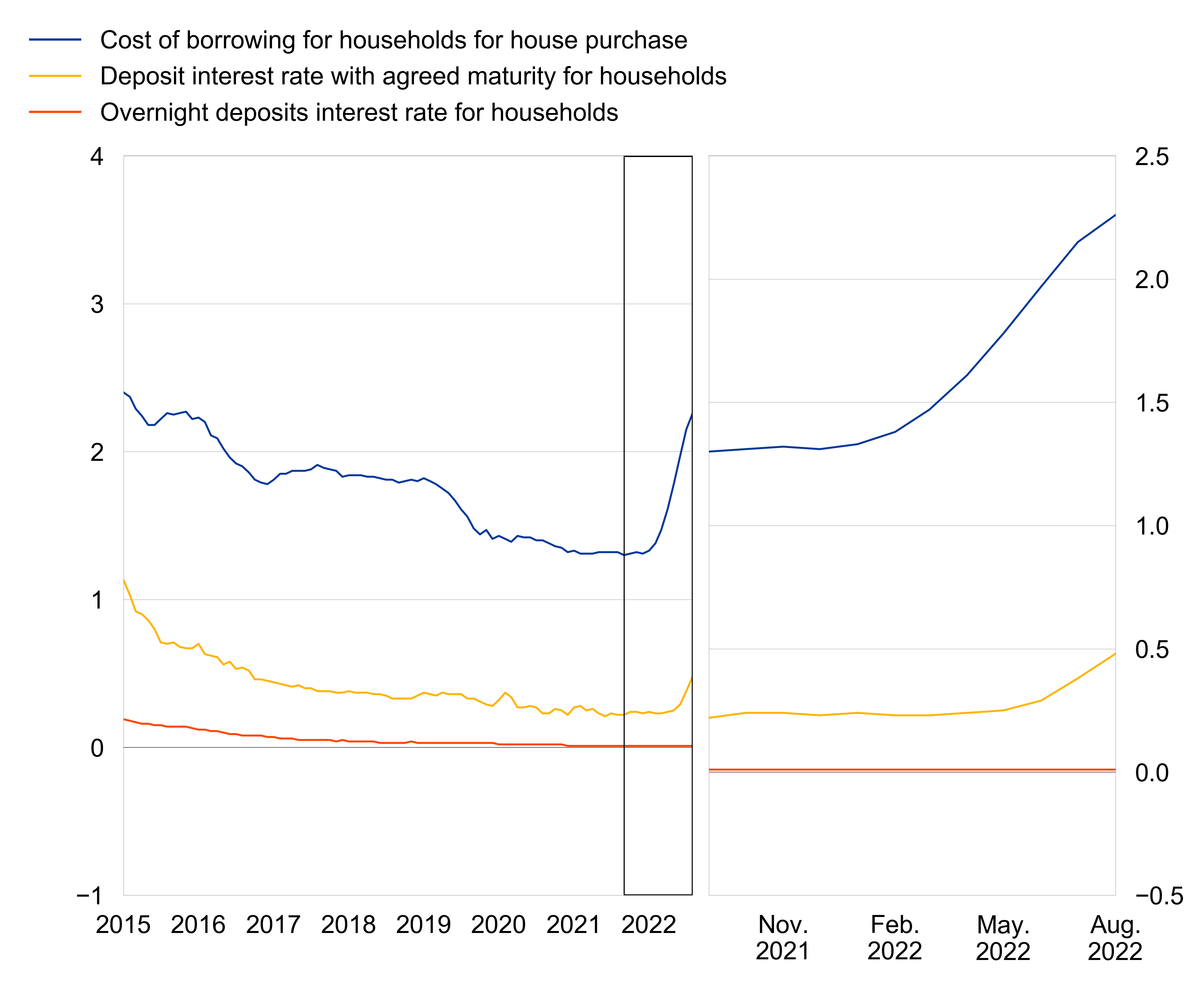 As regards new deposits from households, the interest rate on deposits with an agreed maturity of up to one year increased by 9 basis points to 0.35%, driven by both the interest rate and the weight effects. The rate on deposits redeemable at three months' notice increased by 24 basis points to 0.70%, driven by the interest rate effect. The interest rate on overnight deposits from households stayed constant at 0.01%.