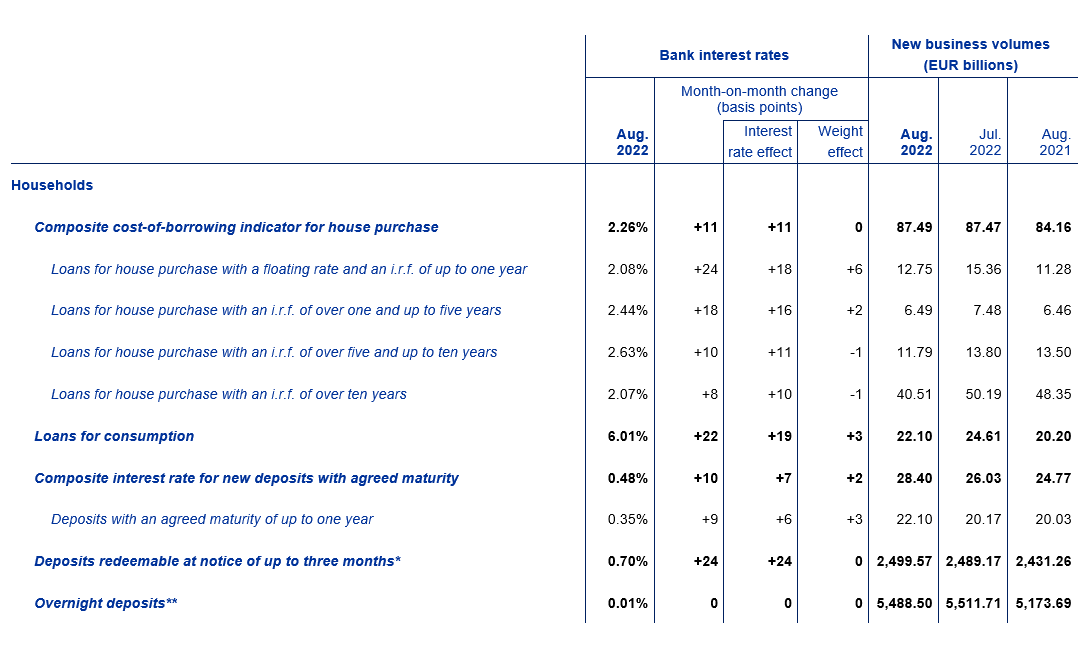The composite cost-of-borrowing indicator, which combines interest rates on all loans to households for house purchase, increased, driven by the interest rate effect in August 2022. The interest rate on loans for house purchase with a floating rate and an initial rate fixation period of up to one year increased by 24 basis points to 2.08%, mainly driven by the interest rate effect. The rate on housing loans with an initial rate fixation period of over one and up to five years rose by 18 basis points to 2.44%, mainly driven by the interest rate effect. The interest rate on loans for house purchase with an initial rate fixation period of over five and up to ten years increased by 10 basis points to 2.63%, driven by the interest rate effect. The rate on housing loans with an initial rate fixation period of over ten years rose by 8 basis points to 2.07%, driven by the interest rate effect. In the same period the interest rate on new loans to households for consumption increased by 22 basis points to 6.01%, mainly driven by the interest rate effect.