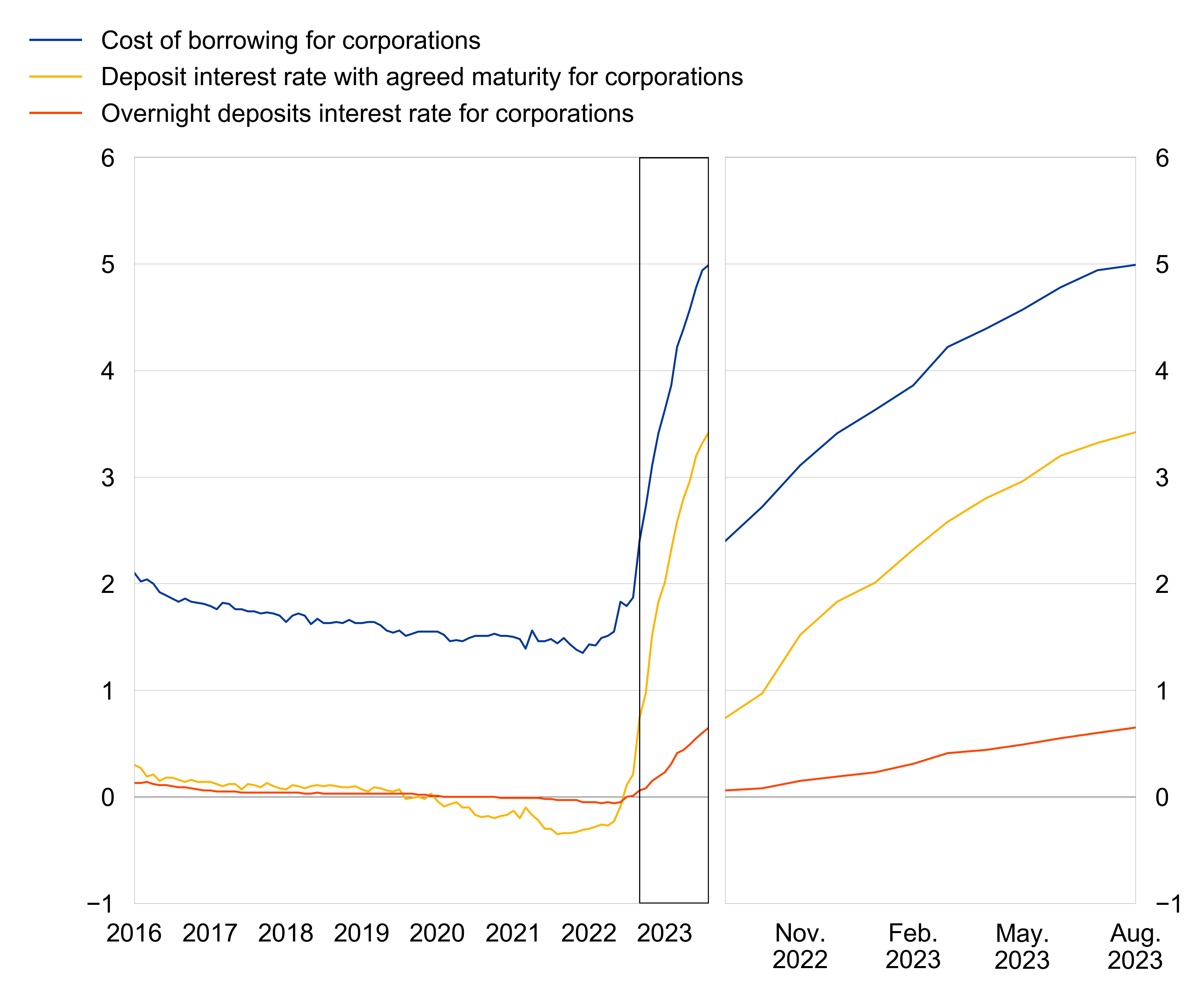 As regards new deposit agreements, the interest rate on deposits from corporations with an agreed maturity of up to one year rose by 12 basis points to 3.42% in August 2023, driven by the interest rate effect. The interest rate on overnight deposits from corporations rose by 5 basis points to 0.65%.