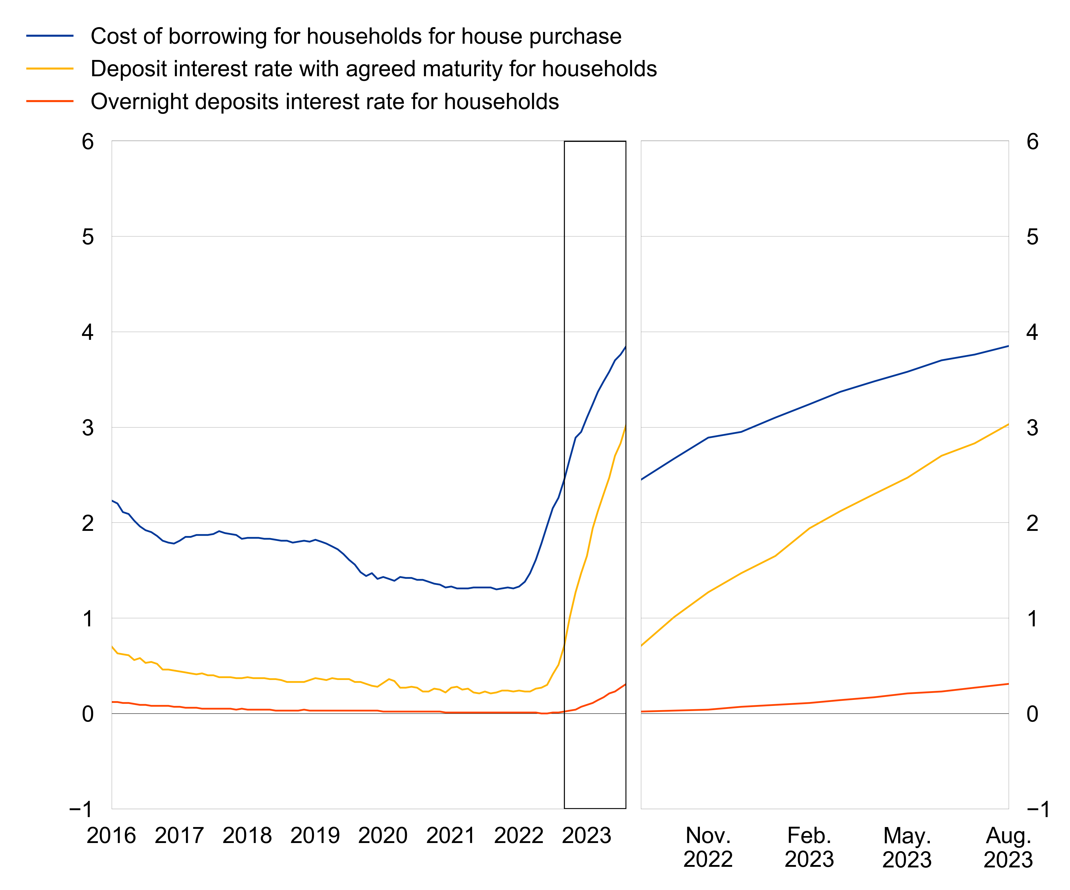 As regards new deposits from households, the interest rate on deposits with an agreed maturity of up to one year increased by 21 basis points to 3.04%, mainly driven by the interest rate effect. The rate on deposits redeemable at three months' notice rose by 8 basis points to 1.51%. The interest rate on overnight deposits from households increased by 4 basis points to 0.31%.